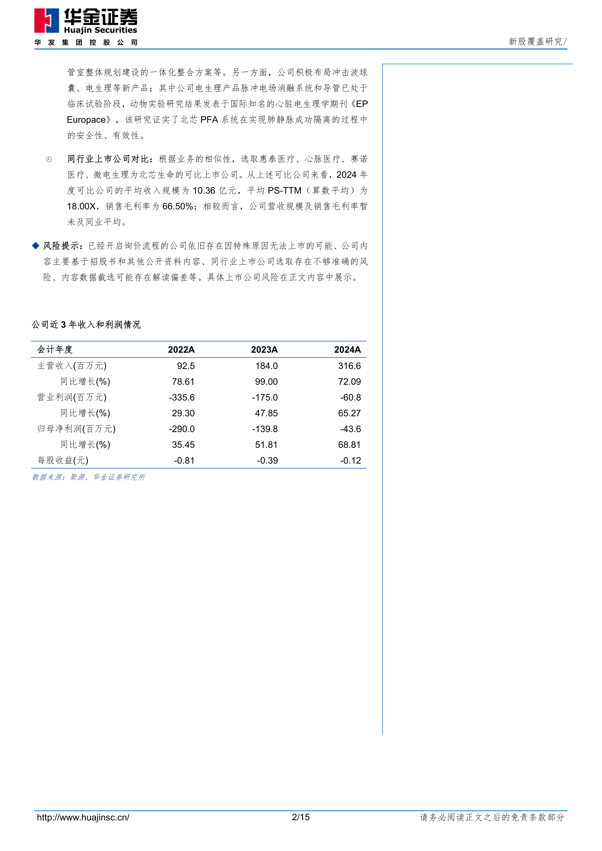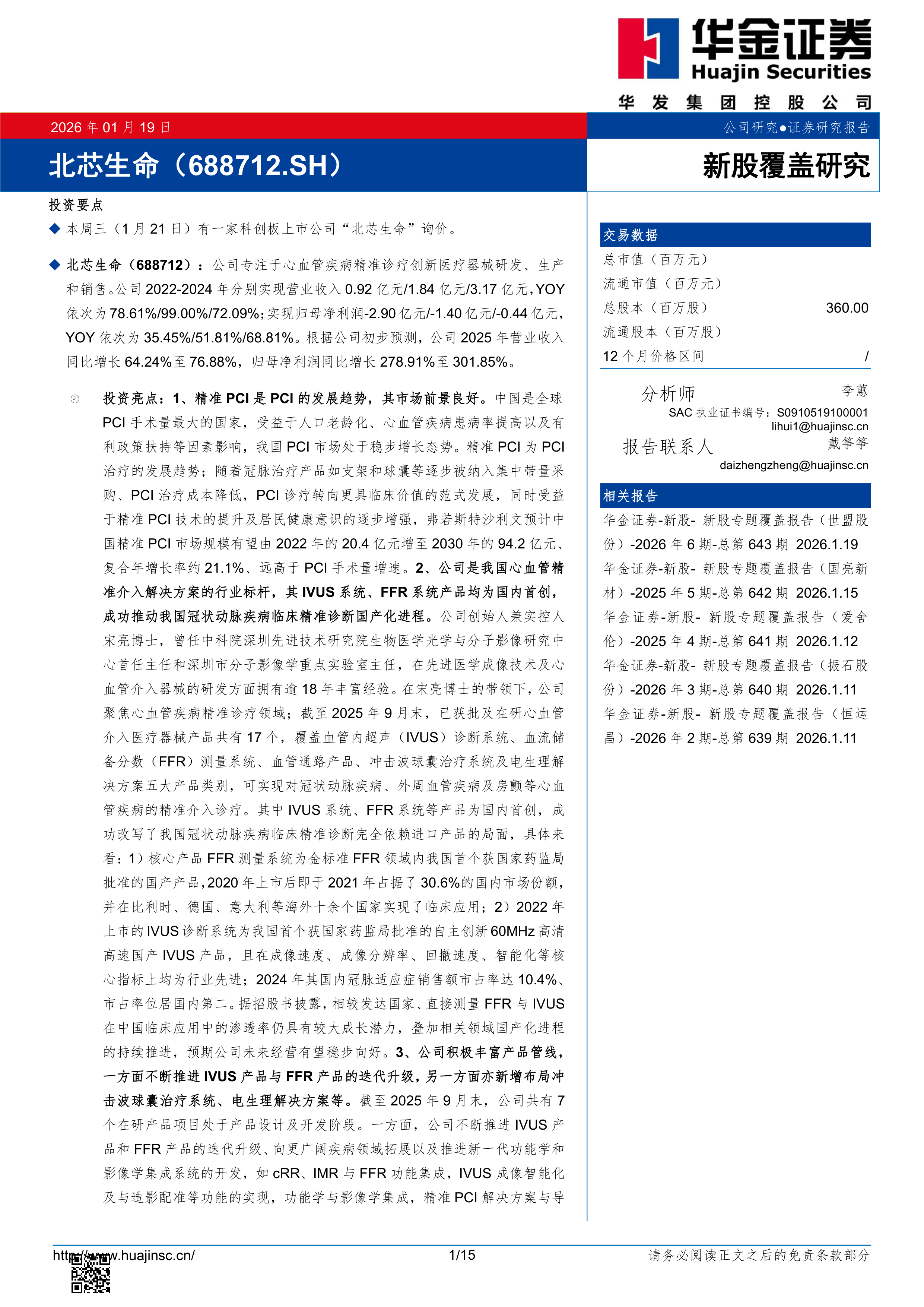 投资亮点:1、精准PCI是PCI的发展趋势,其市场前景良好。中国是全球PCI手术量最大的国家,受益于人口老龄化、心血管疾病患病率提高以及有利政策扶持等因素影响,我国PCI市场处于稳步增长态势。精准PCI为PCI治疗的发展趋势;随着冠脉治疗产品如支架和球囊等逐步被纳入集中带量采购、PCI治疗成本降低,PCI诊疗转向更具临床价值的范式发展,同时受益于精准PCI技术的提升及居民健康意识的逐步增强,弗若斯特沙利文预计中国精准PCI市场规模有望由2022年的20.4亿元增至2030年的94.2亿元、复合年增长率约21.1%、远高于PCI手术量增速。2、公司是我国心血管精准介入解决方案的行业标杆,其IVUS系统、FFR系统产品均为国内首创,成功推动我国冠状动脉疾病临床精准诊断国产化进程。公司创始人兼实控人宋亮博士,曾任中科院深圳先进技术研究院生物医学光学与分子影像研究中心首任主任和深圳市分子影像学重点实验室主任,在先进医学成像技术及心血管介入器械的研发方面拥有逾18年丰富经验。在宋亮博士的带领下,公司聚焦心血管疾病精准诊疗领域;截至2025年9月末,已获批及在研心血管介入医疗器械产品共有17个,覆盖血管内超声(IVUS)诊断系统、血流储备分数(FFR)测量系统、血管通路产品、冲击波球囊治疗系统及电生理解决方案五大产品类别,可实现对冠状动脉疾病、外周血管疾病及房颤等心血管疾病的精准介入诊疗。其中IVUS系统、FFR系统等产品为国内首创,成功改写了我国冠状动脉疾病临床精准诊断完全依赖进口产品的局面,具体来看:1)核心产品FFR测量系统为金标准FFR领域内我国首个获国家药监局批准的国产产品,2020年上市后即于2021年占据了30.6%的国内市场份额,并在比利时、德国、意大利等海外十余个国家实现了临床应用;2)2022年上市的IVUS诊断系统为我国首个获国家药监局批准的自主创新60MHz高清高速国产IVUS产品,且在成像速度、成像分辨率、回撤速度、智能化等核心指标上均为行业先进;2024年其国内冠脉适应症销售额市占率达10.4%、市占率位居国内第二。据招股书披露,相较发达国家、直接测量FFR与IVUS在中国临床应用中的渗透率仍具有较大成长潜力,叠加相关领域国产化进程的持续推进,预期公司未来经营有望稳步向好。3、公司积极丰富产品管线,一方面不断推进IVUS产品与FFR产品的迭代升级,另一方面亦新增布局冲击波球囊治疗系统、电生理解决方案等。截至2025年9月末,公司共有7个在研产品项目处于产品设计及开发阶段。一方面,公司不断推进IVUS产品和FFR产品的迭代升级、向更广阔疾病领域拓展以及推进新一代功能学和影像学集成系统的开发,如cRR、IMR与FFR功能集成,IVUS成像智能化及与造影配准等功能的实现,功能学与影像学集成,精准PCI解决方案与导管室整体规划建设的一体化整合方案等。另一方面,公司积极布局冲击波球囊、电生理等新产品;其中公司电生理产品脉冲电场消融系统和导管已处于临床试验阶段,动物实验研究结果发表于国际知名的心脏电生理学期刊《EPEuropace》,该研究证实了北芯PFA系统在实现肺静脉成功隔离的过程中的安全性、有效性。