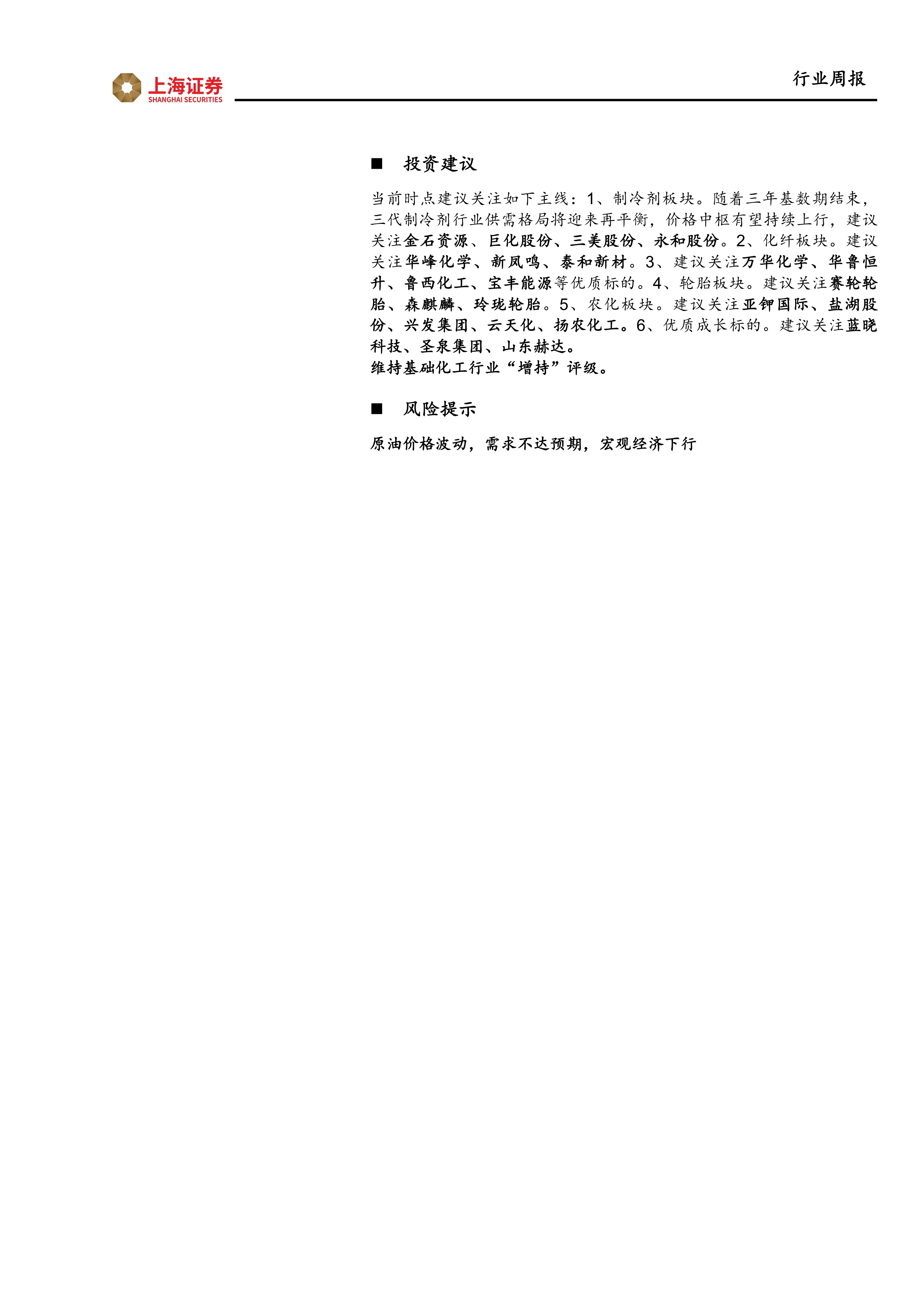 当前时点建议关注如下主线:1、制冷剂板块。随着三年基数期结束,三代制冷剂行业供需格局将迎来再平衡,价格中枢有望持续上行,建议关注金石资源、巨化股份、三美股份、永和股份。2、化纤板块。建议关注华峰化学、新凤鸣、泰和新材。3、建议关注万华化学、华鲁恒升、鲁西化工、宝丰能源等优质标的。4、轮胎板块。建议关注赛轮轮胎、森麒麟、玲珑轮胎。5、农化板块。建议关注亚钾国际、盐湖股份、兴发集团、云天化、扬农化工。6、优质成长标的。建议关注蓝晓科技、圣泉集团、山东赫达。维持基础化工行业“增持”评级。