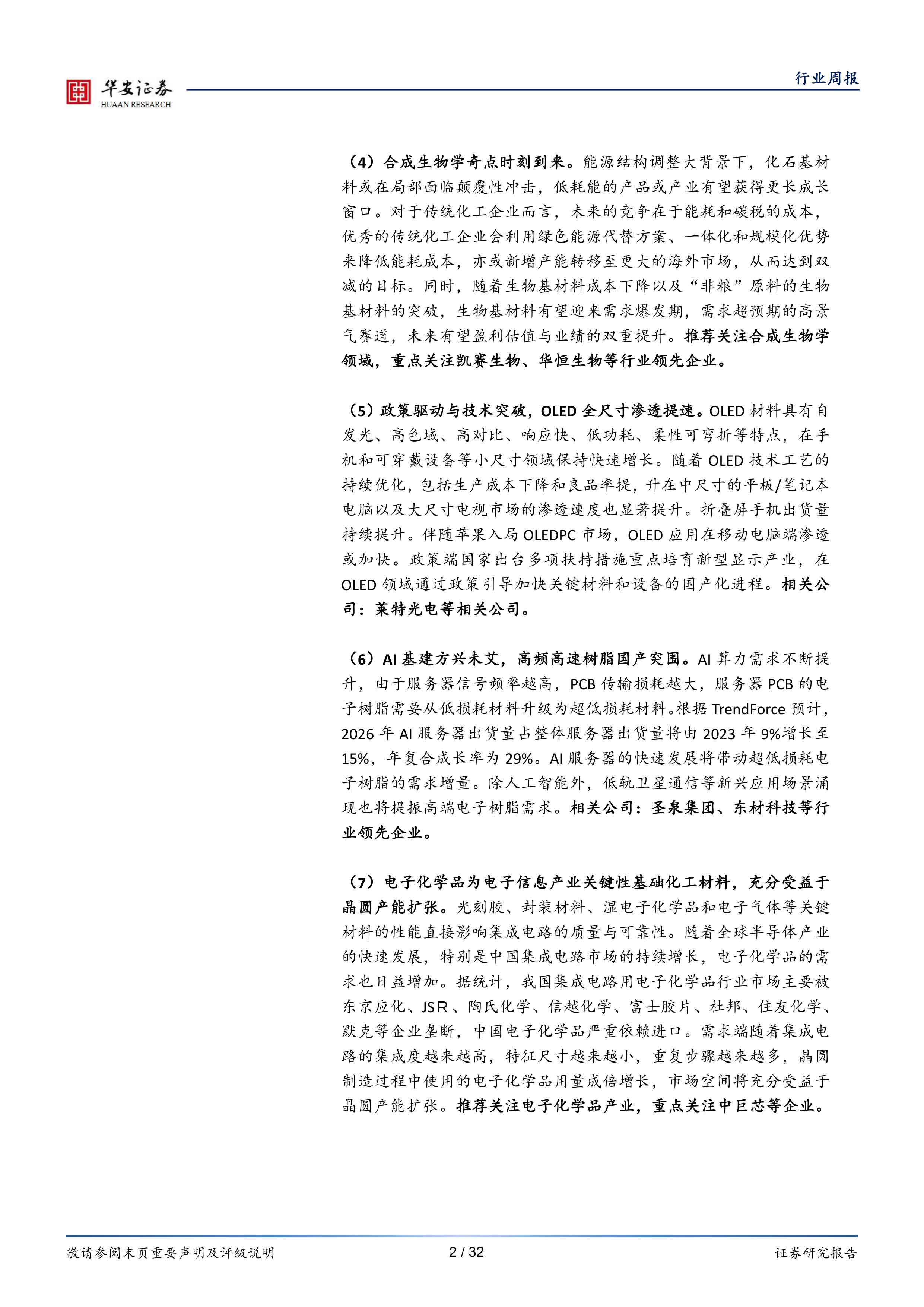 (6)AI基建方兴未艾,高频高速树脂国产突围。AI算力需求不断提升,由于服务器信号频率越高,PCB传输损耗越大,服务器PCB的电子树脂需要从低损耗材料升级为超低损耗材料。根据TrendForce预计,2026年AI服务器出货量占整体服务器出货量将由2023年9%增长至15%,年复合成长率为29%。AI服务器的快速发展将带动超低损耗电子树脂的需求增量。除人工智能外,低轨卫星通信等新兴应用场景涌现也将提振高端电子树脂需求。相关公司:圣泉集团、东材科技等行业领先企业。