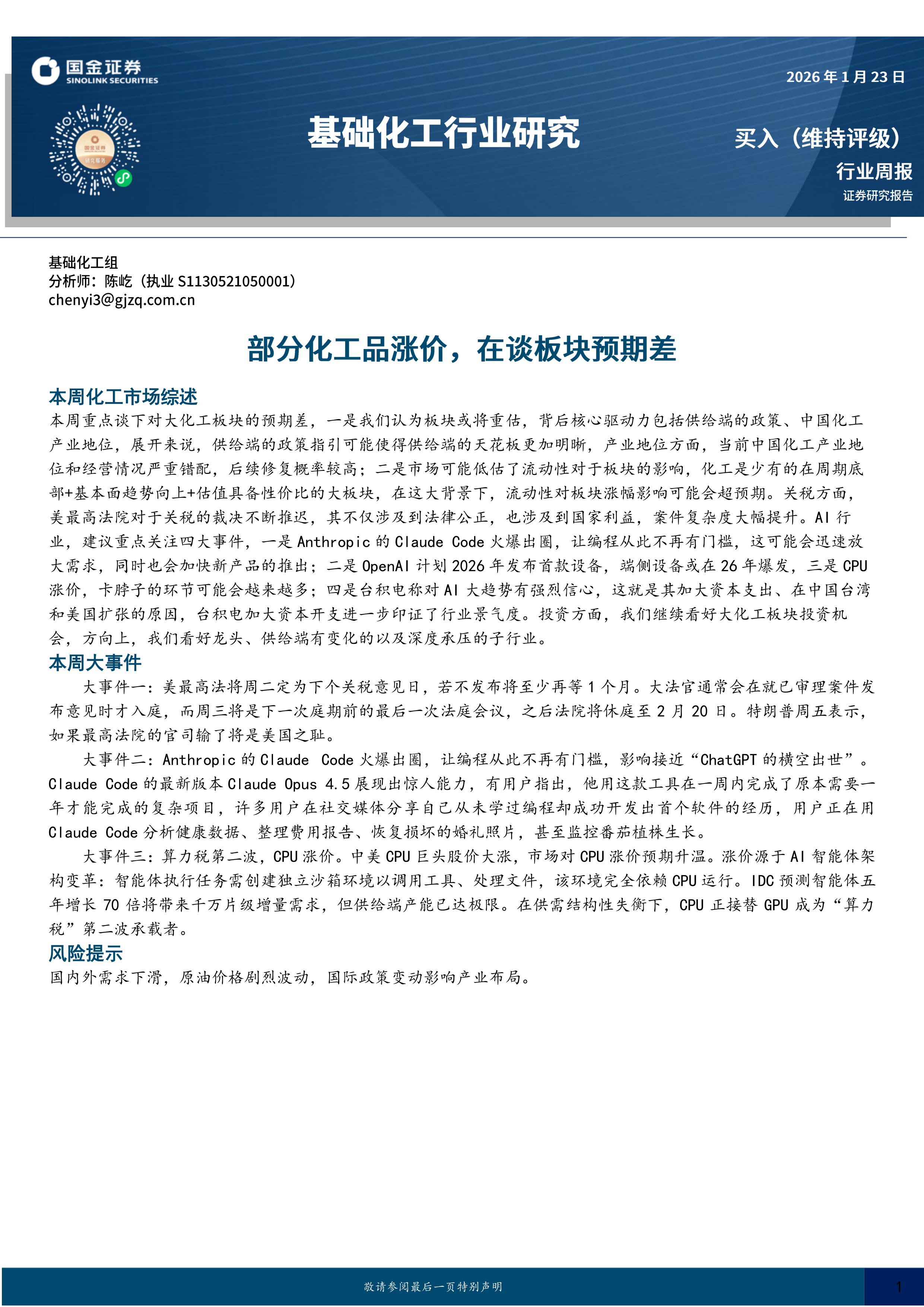 本周重点谈下对大化工板块的预期差,一是我们认为板块或将重估,背后核心驱动力包括供给端的政策、中国化工产业地位,展开来说,供给端的政策指引可能使得供给端的天花板更加明晰,产业地位方面,当前中国化工产业地位和经营情况严重错配,后续修复概率较高;二是市场可能低估了流动性对于板块的影响,化工是少有的在周期底部+基本面趋势向上+估值具备性价比的大板块,在这大背景下,流动性对板块涨幅影响可能会超预期。关税方面,美最高法院对于关税的裁决不断推迟,其不仅涉及到法律公正,也涉及到国家利益,案件复杂度大幅提升。AI行业,建议重点关注四大事件,一是Anthropic的Claude Code火爆出圈,让编程从此不再有门槛,这可能会迅速放大需求,同时也会加快新产品的推出;二是OpenAI计划2026年发布首款设备,端侧设备或在26年爆发,三是CPU涨价,卡脖子的环节可能会越来越多;四是台积电称对AI大趋势有强烈信心,这就是其加大资本支出、在中国台湾和美国扩张的原因,台积电加大资本开支进一步印证了行业景气度。投资方面,我们继续看好大化工板块投资机会,方向上,我们看好龙头、供给端有变化的以及深度承压的子行业。