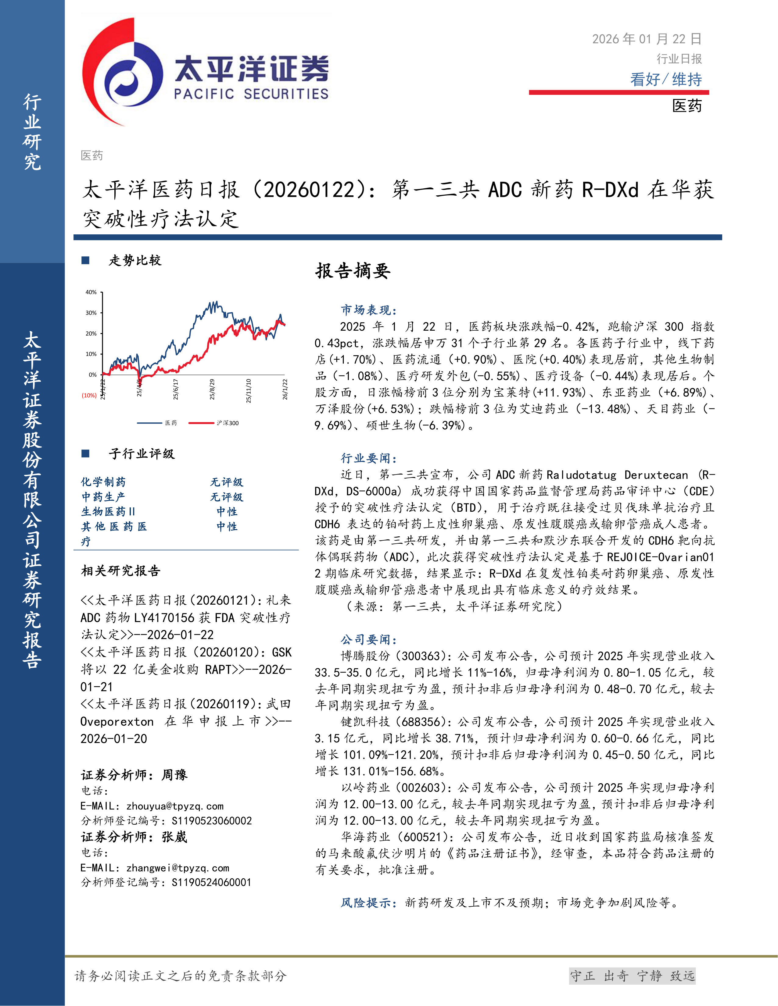 2025年1月22日,医药板块涨跌幅-0.42%,跑输沪深300指数0.43pct,涨跌幅居申万31个子行业第29名。各医药子行业中,线下药店(+1.70%)、医药流通(+0.90%)、医院(+0.40%)表现居前,其他生物制品(-1.08%)、医疗研发外包(-0.55%)、医疗设备(-0.44%)表现居后。个股方面,日涨幅榜前3位分别为宝莱特(+11.93%)、东亚药业(+6.89%)、万泽股份(+6.53%);跌幅榜前3位为艾迪药业(-13.48%)、天目药业(-9.69%)、硕世生物(-6.39%)。