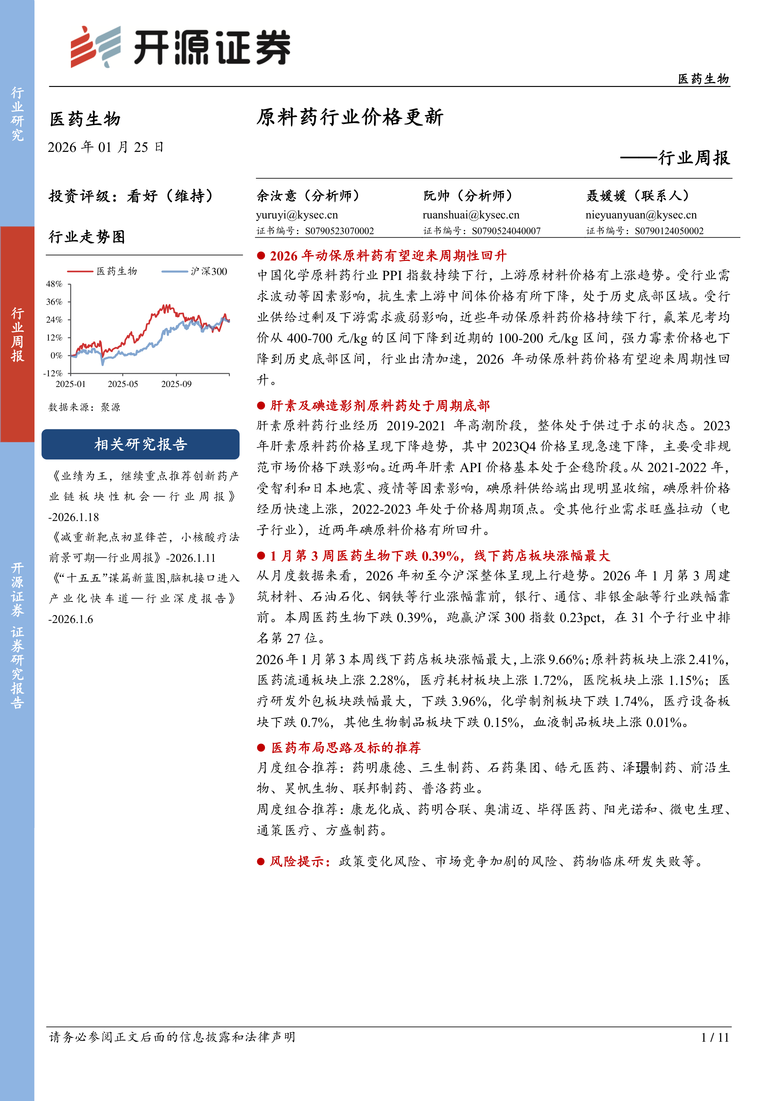医药生物行业周报:原料药行业价格更新