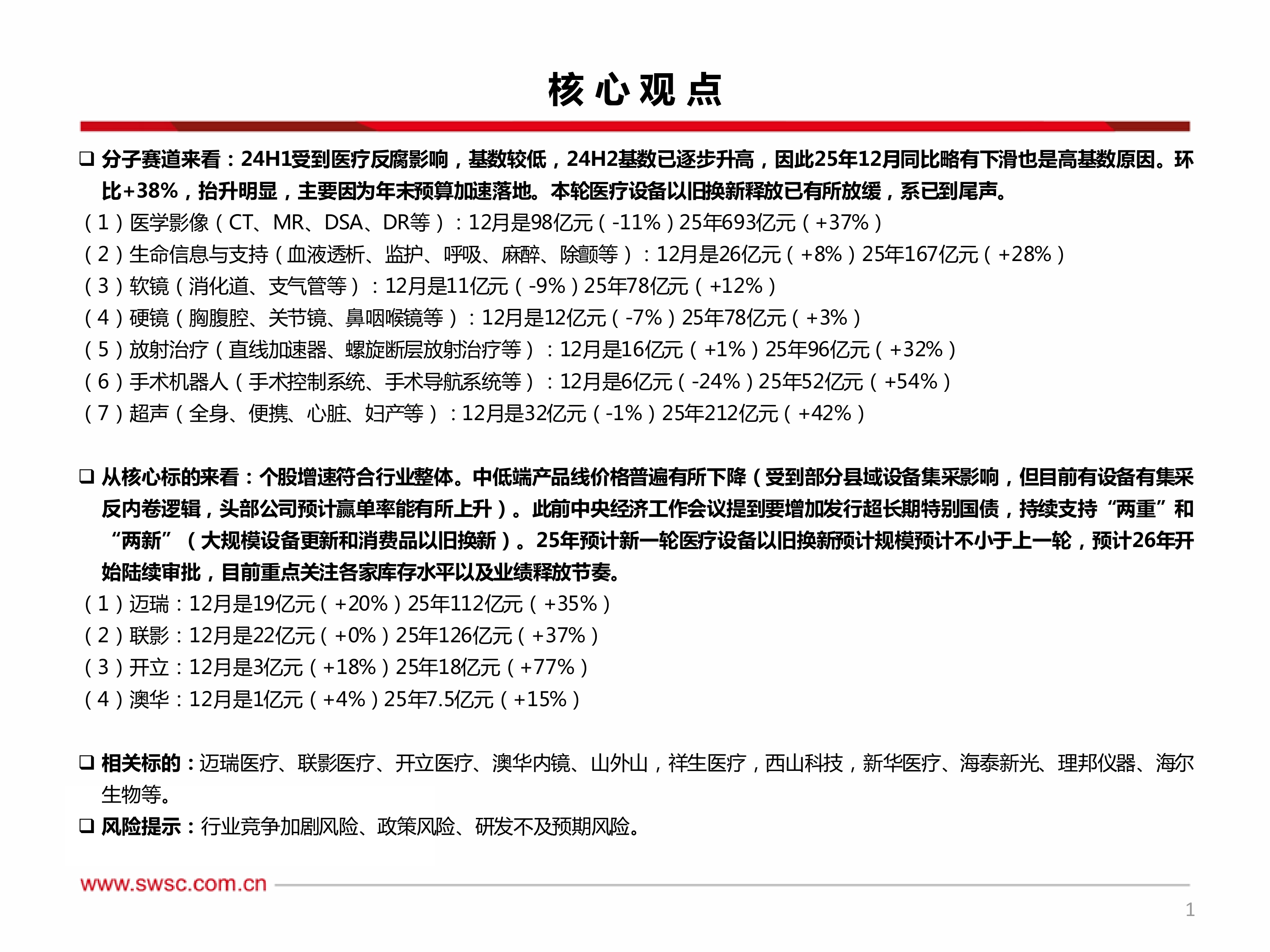 从核心标的来看:个股增速符合行业整体。中低端产品线价格普遍有所下降(受到部分县域设备集采影响,但目前有设备有集采反内卷逻辑,头部公司预计赢单率能有所上升)。此前中央经济工作会议提到要增加发行超长期特别国债,持续支持“两重”和“两新”(大规模设备更新和消费品以旧换新)。25年预计新一轮医疗设备以旧换新预计规模预计不小于上一轮,预计26年开始陆续审批,目前重点关注各家库存水平以及业绩释放节奏。