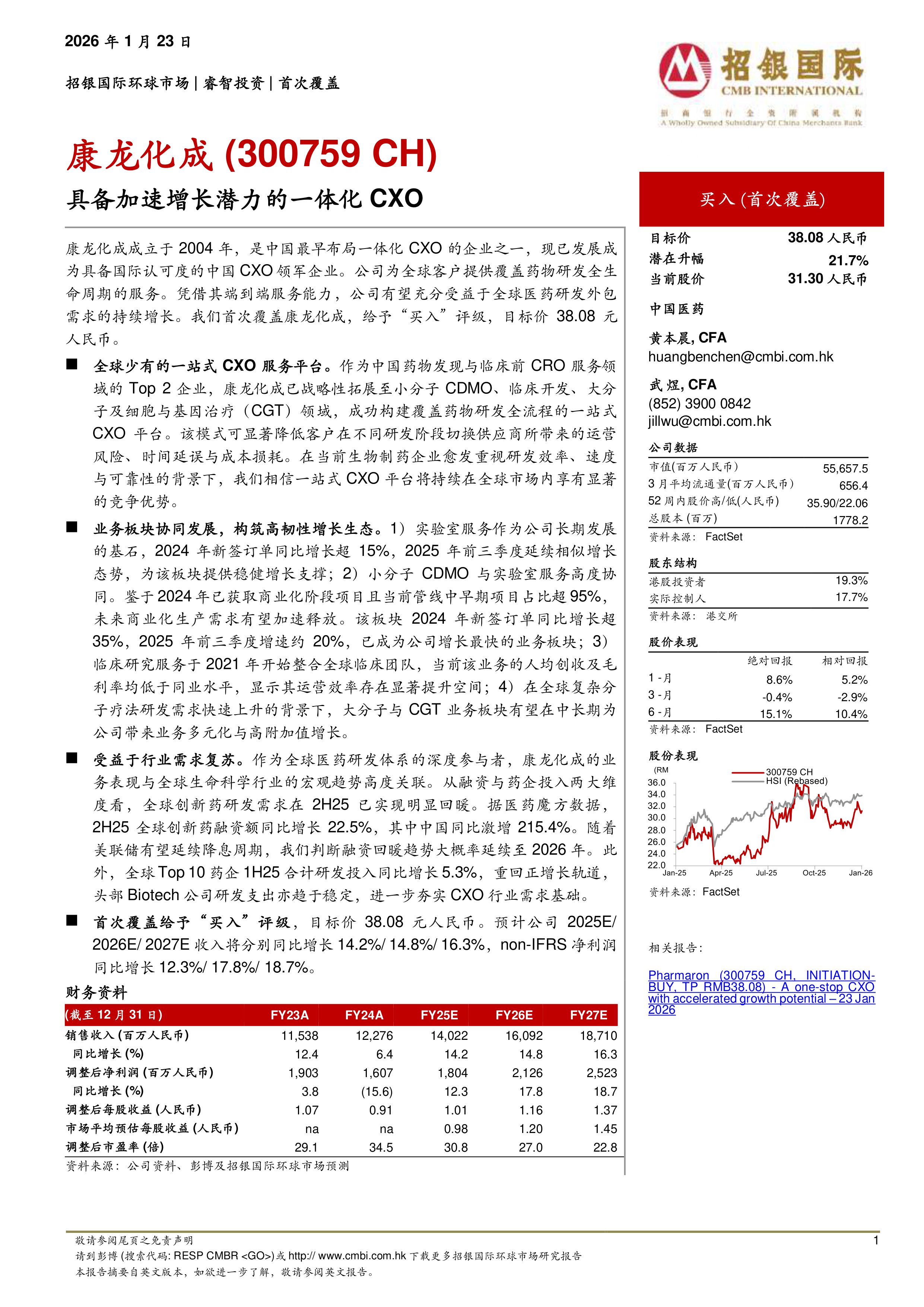 康龙化成成立于2004年,是中国最早布局一体化CXO的企业之一,现已发展成为具备国际认可度的中国CXO领军企业。公司为全球客户提供覆盖药物研发全生命周期的服务。凭借其端到端服务能力,公司有望充分受益于全球医药研发外包需求的持续增长。我们首次覆盖康龙化成,给予“买入”评级,目标价38.08元人民币。