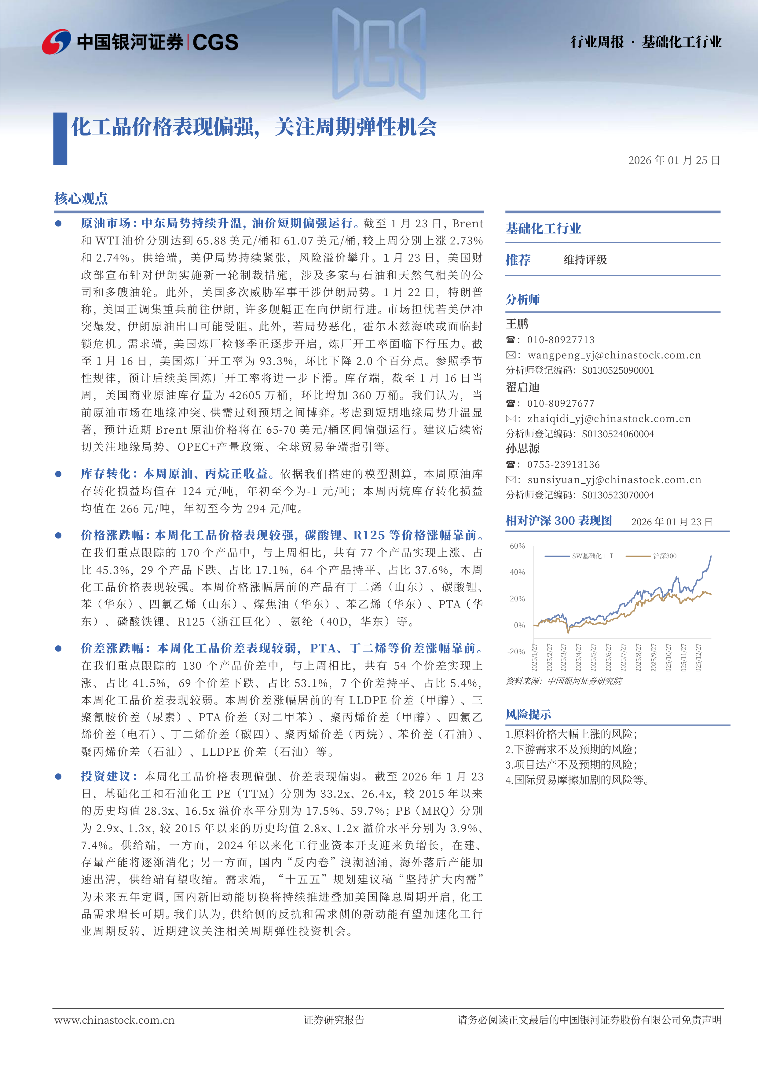 投资建议:本周化工品价格表现偏强、价差表现偏弱。截至2026年1月23