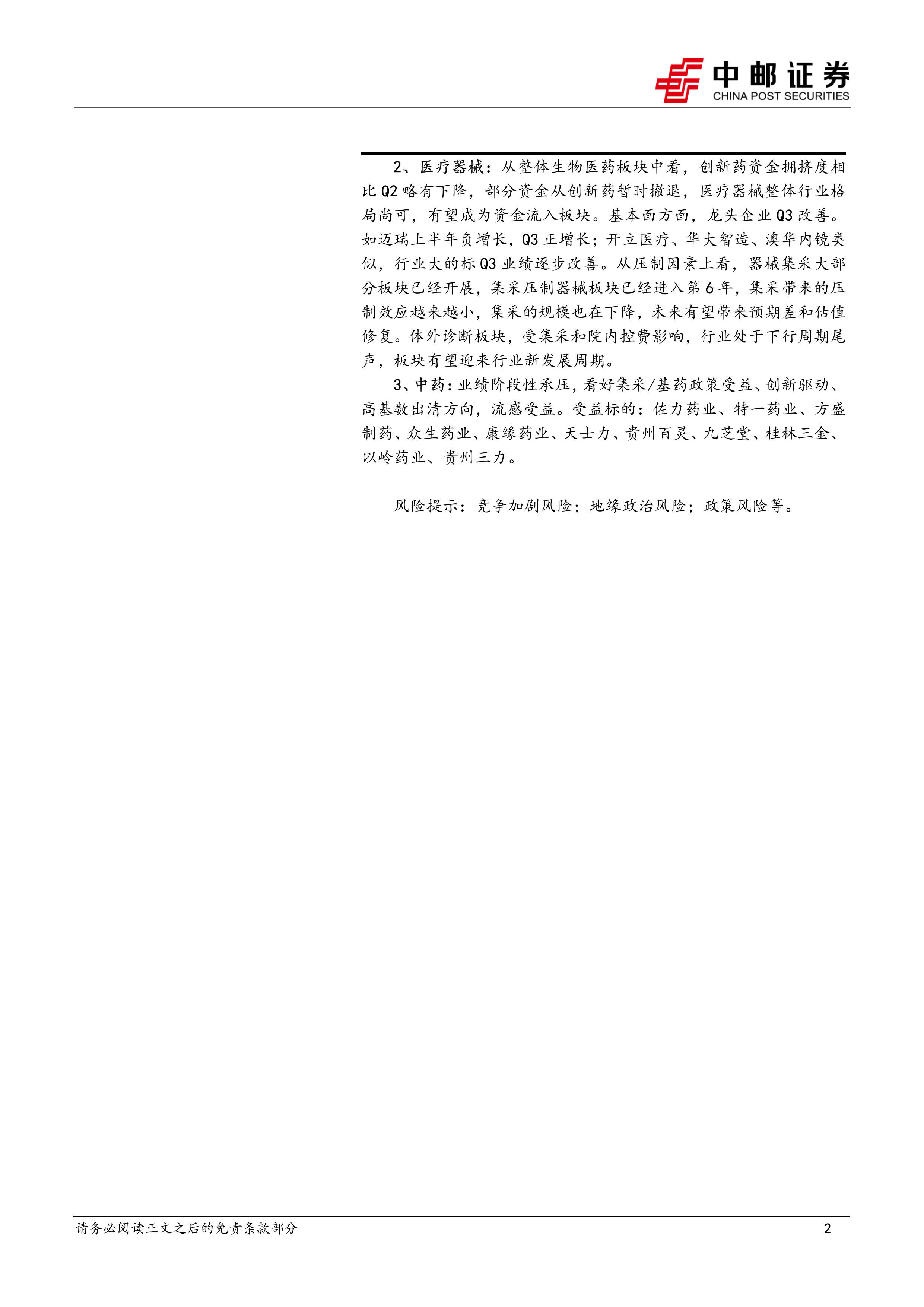 2、医疗器械:从整体生物医药板块中看,创新药资金拥挤度相比Q2略有下降,部分资金从创新药暂时撤退,医疗器械整体行业格局尚可,有望成为资金流入板块。基本面方面,龙头企业Q3改善。如迈瑞上半年负增长,Q3正增长;开立医疗、华大智造、澳华内镜类似,行业大的标Q3业绩逐步改善。从压制因素上看,器械集采大部分板块已经开展,集采压制器械板块已经进入第6年,集采带来的压制效应越来越小,集采的规模也在下降,未来有望带来预期差和估值修复。体外诊断板块,受集采和院内控费影响,行业处于下行周期尾声,板块有望迎来行业新发展周期。