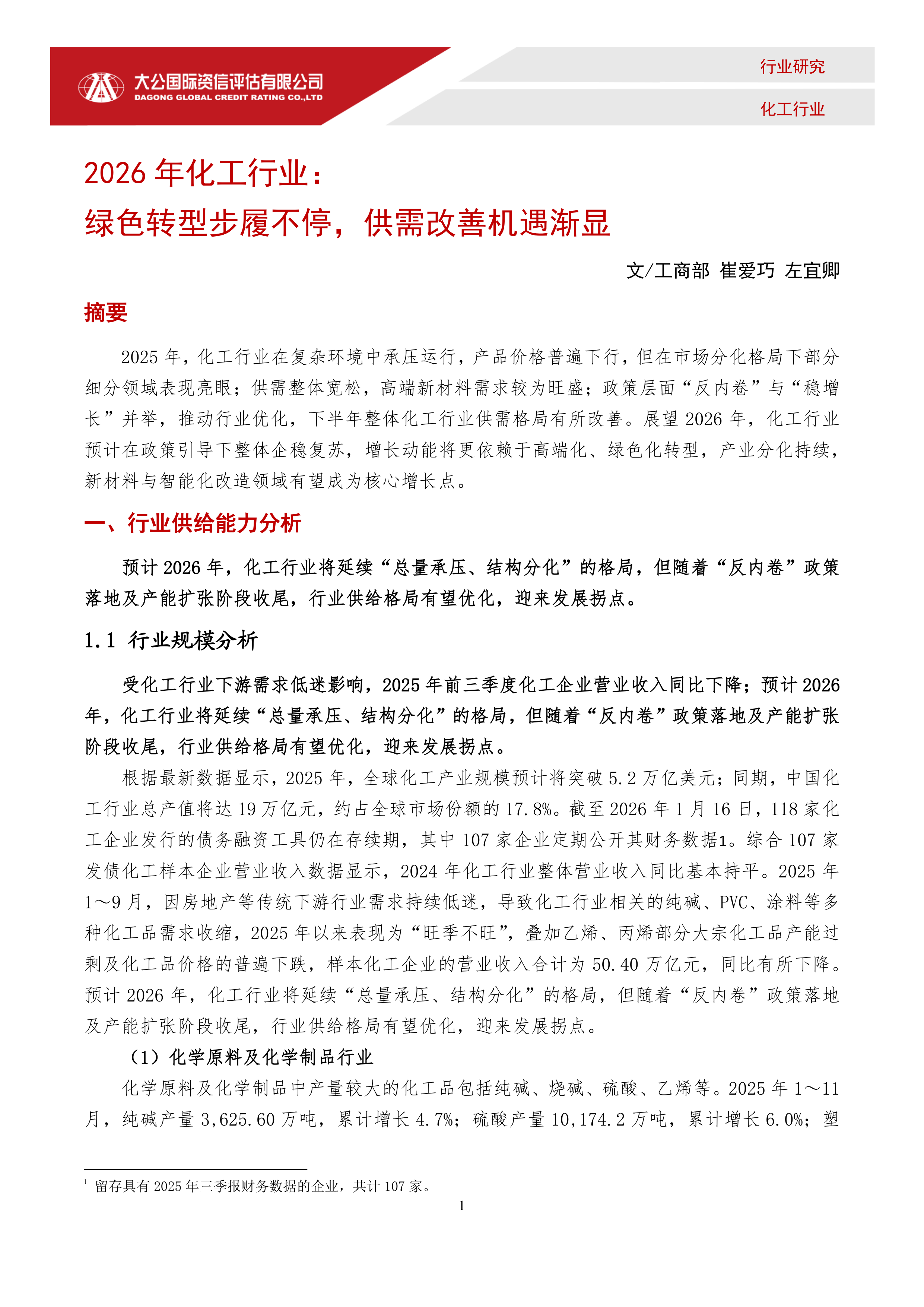 2025年,化工行业在复杂环境中承压运行,产品价格普遍下行,但在市场分化格局下部分细分领域表现亮眼;供需整体宽松,高端新材料需求较为旺盛;政策层面“反内卷”与“稳增长”并举,推动行业优化,下半年整体化工行业供需格局有所改善。展望2026年,化工行业预计在政策引导下整体企稳复苏,增长动能将更依赖于高端化、绿色化转型,产业分化持续,新材料与智能化改造领域有望成为核心增长点。