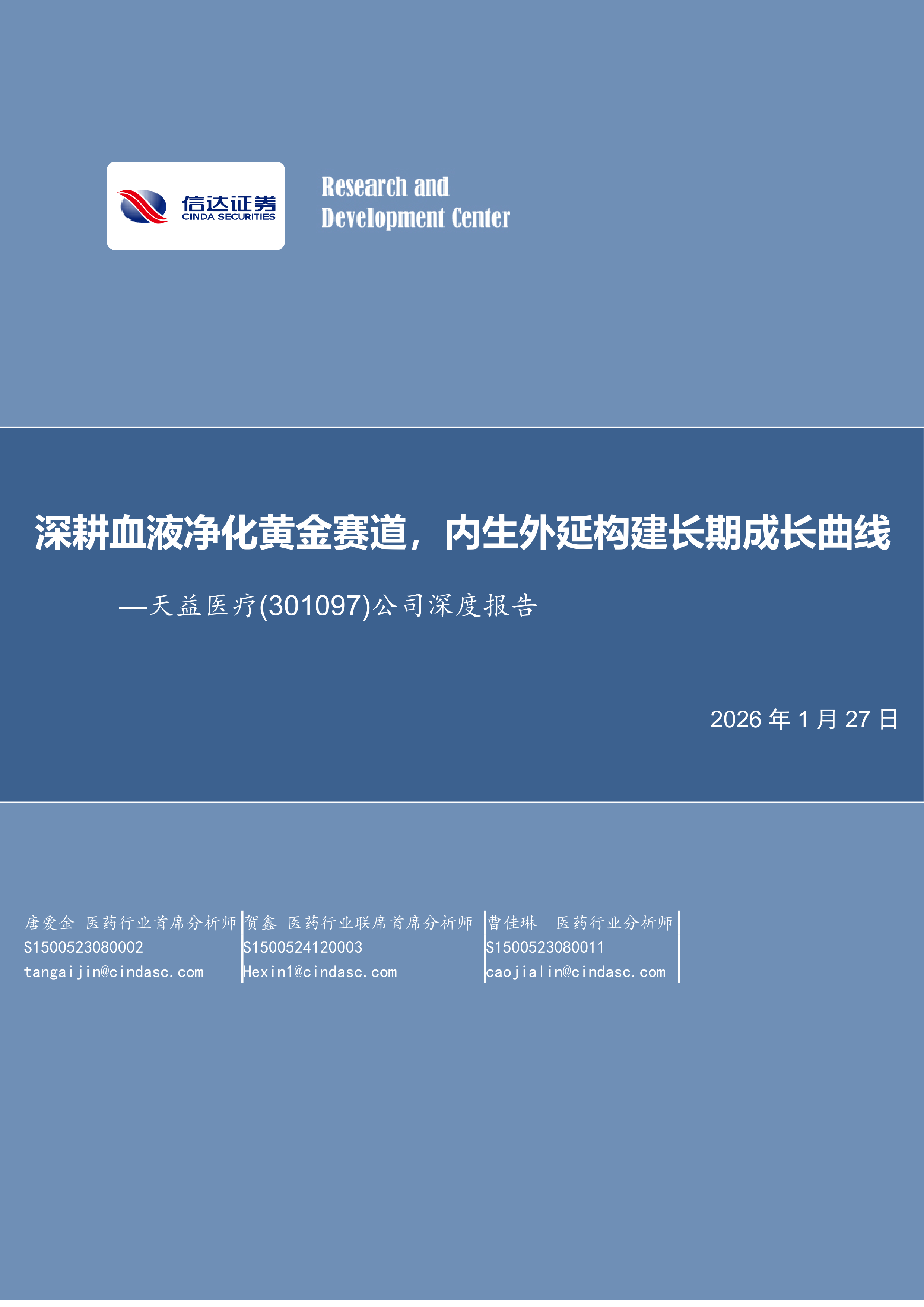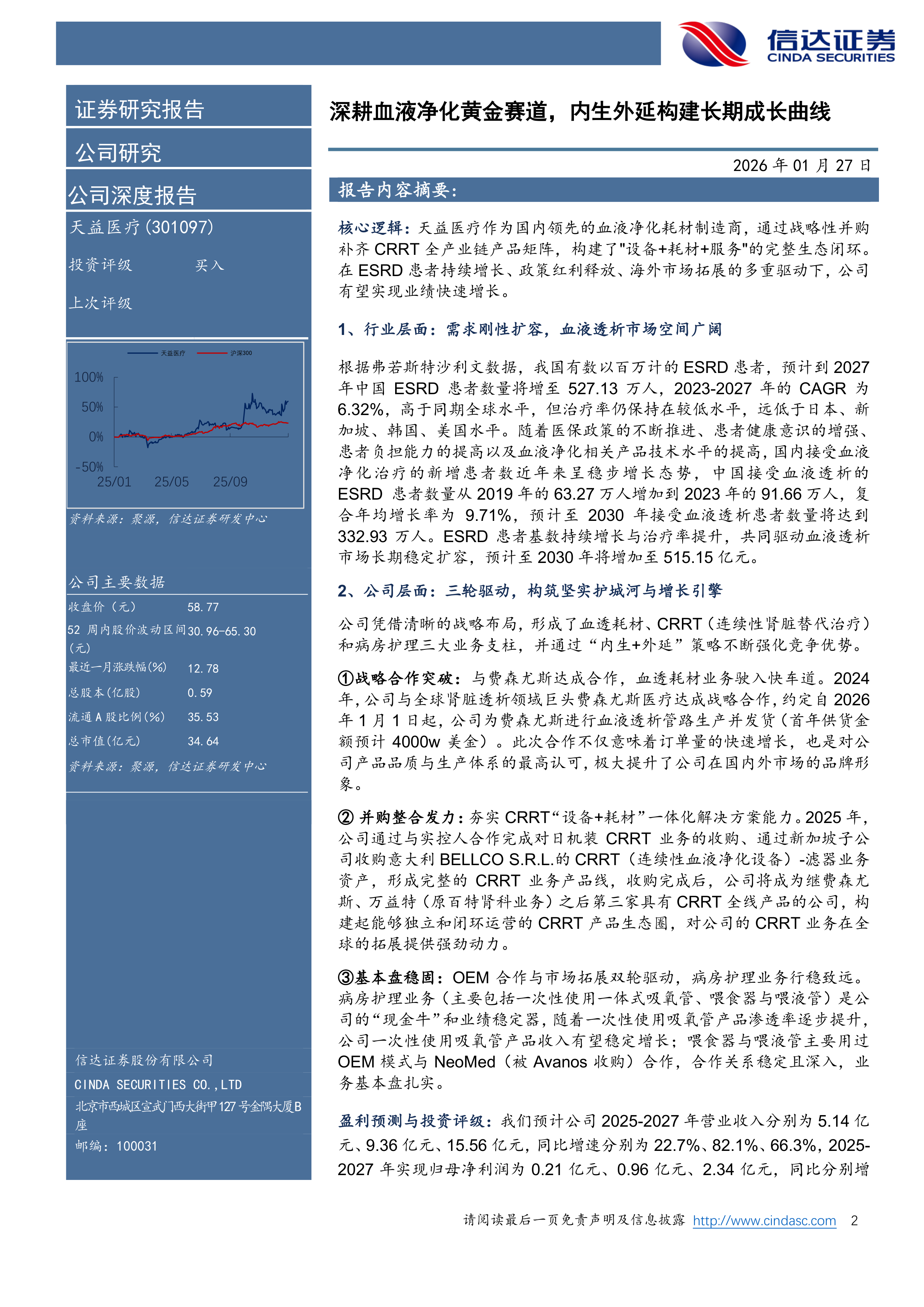 核心逻辑:天益医疗作为国内领先的血液净化耗材制造商,通过战略性并购补齐CRRT全产业链产品矩阵,构建了"设备+耗材+服务"的完整生态闭环。在ESRD患者持续增长、政策红利释放、海外市场拓展的多重驱动下,公司有望实现业绩快速增长。