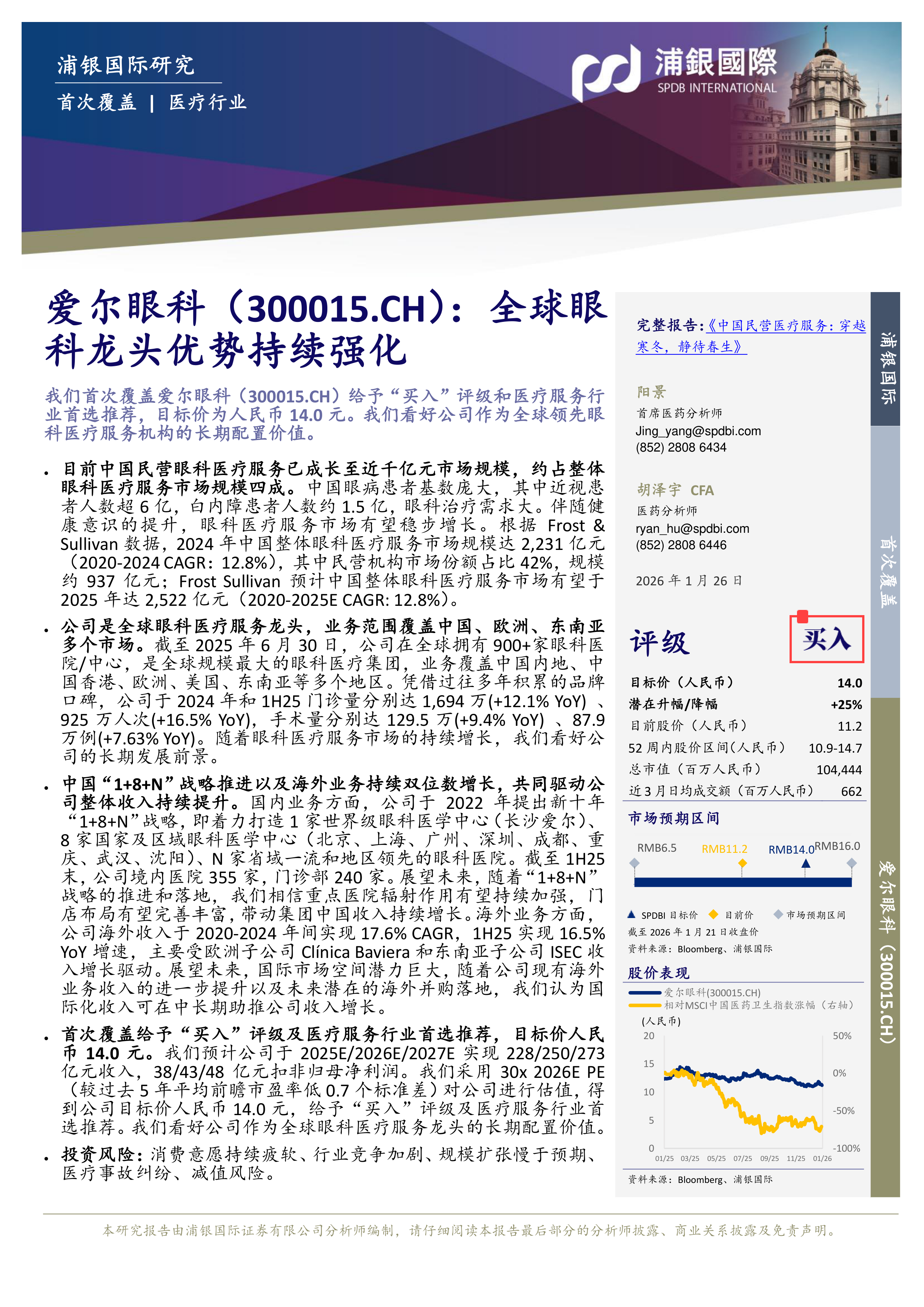我们首次覆盖爱尔眼科(300015.CH)给予“买入”评级和医疗服务行业首选推荐,目标价为人民币14.0元。我们看好公司作为全球领先眼科医疗服务机构的长期配置价值。