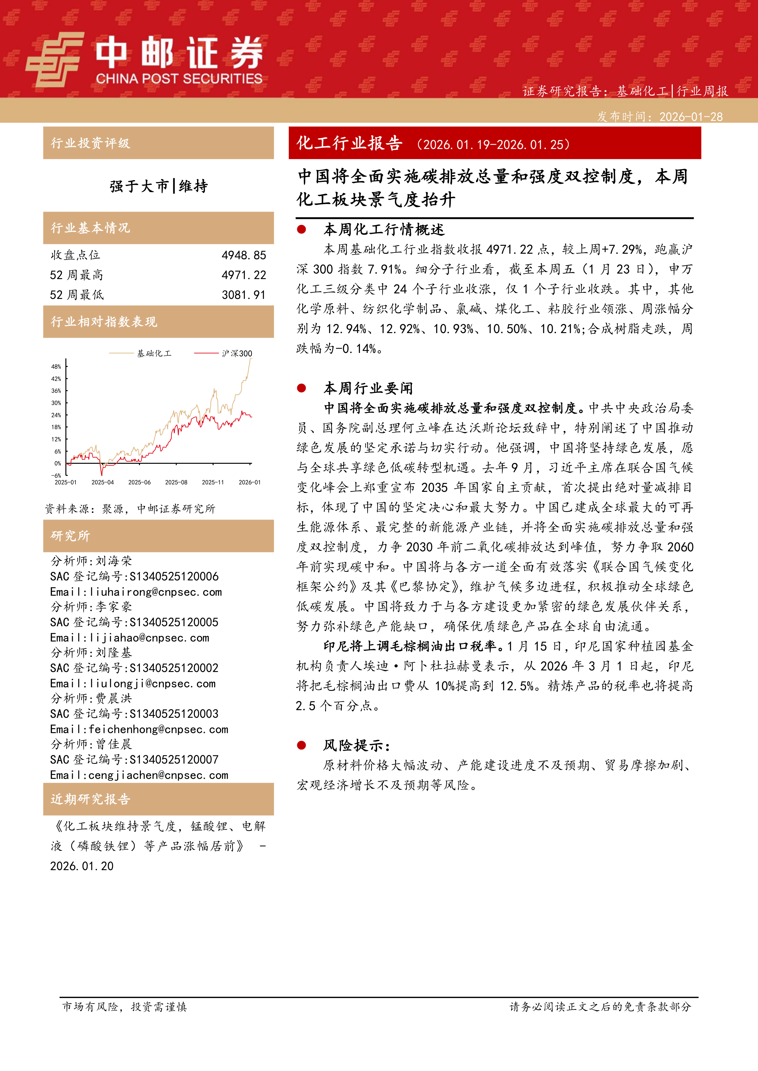 化工行业报告:中国将全面实施碳排放总量和强度双控制度,本周化工板块景气度抬升
