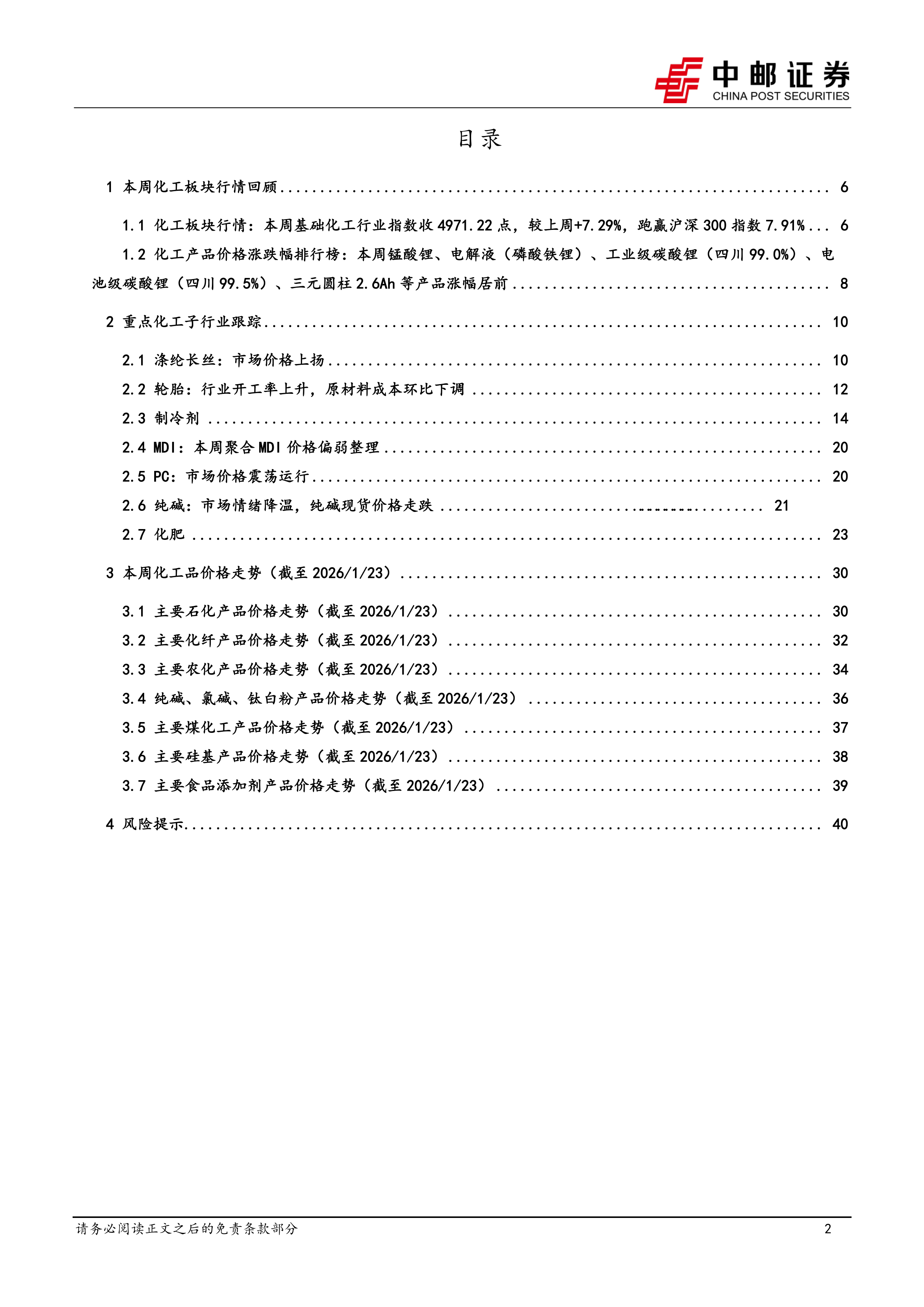 本周基础化工行业指数收报4971.22点,较上周+7.29%,跑赢沪深300指数7.91%。细分子行业看,截至本周五(1月23日),申万化工三级分类中24个子行业收涨,仅1个子行业收跌。其中,其他化学原料、纺织化学制品、氯碱、煤化工、粘胶行业领涨、周涨幅分别为12.94%、12.92%、10.93%、10.50%、10.21%;合成树脂走跌,周跌幅为-0.14%。