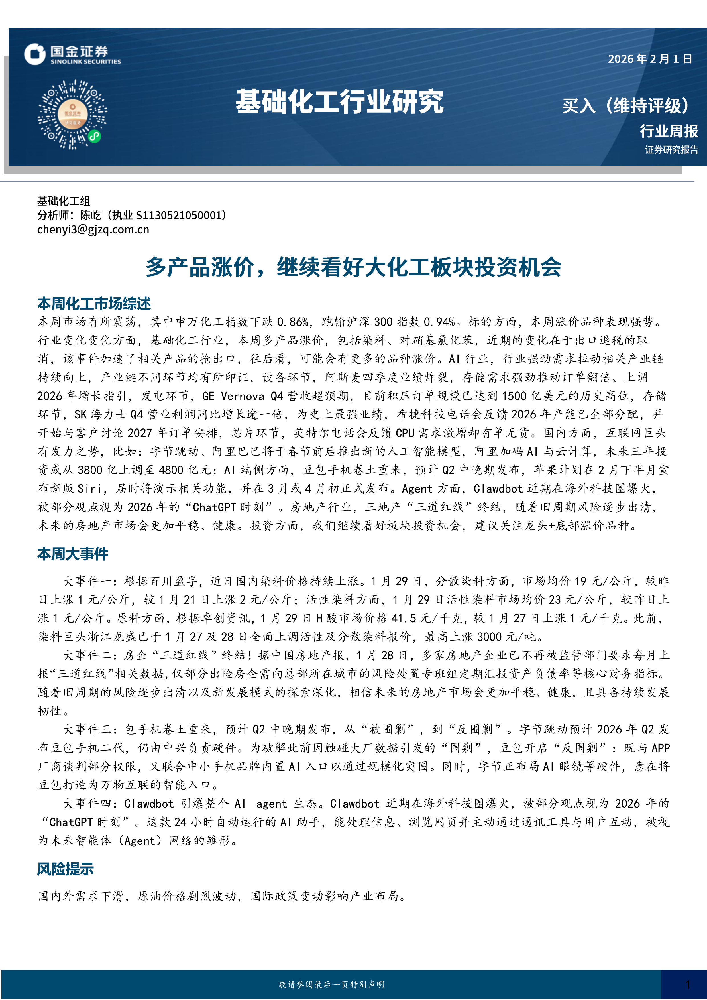 本周市场有所震荡,其中申万化工指数下跌0.86%,跑输沪深300指数0.94%。标的方面,本周涨价品种表现强势。行业变化变化方面,基础化工行业,本周多产品涨价,包括染料、对硝基氯化苯,近期的变化在于出口退税的取消,该事件加速了相关产品的抢出口,往后看,可能会有更多的品种涨价。AI行业,行业强劲需求拉动相关产业链持续向上,产业链不同环节均有所印证,设备环节,阿斯麦四季度业绩炸裂,存储需求强劲推动订单翻倍、上调2026年增长指引,发电环节,GE Vernova Q4营收超预期,目前积压订单规模已达到1500亿美元的历史高位,存储环节,SK海力士Q4营业利润同比增长逾一倍,为史上最强业绩,希捷科技电话会反馈2026年产能已全部分配,并开始与客户讨论2027年订单安排,芯片环节,英特尔电话会反馈CPU需求激增却有单无货。国内方面,互联网巨头有发力之势,比如:字节跳动、阿里巴巴将于春节前后推出新的人工智能模型,阿里加码AI与云计算,未来三年投资或从3800亿上调至4800亿元;AI端侧方面,豆包手机卷土重来,预计Q2中晚期发布,苹果计划在2月下半月宣布新版Siri,届时将演示相关功能,并在3月或4月初正式发布。Agent方面,Clawdbot近期在海外科技圈爆火,被部分观点视为2026年的“ChatGPT时刻”。房地产行业,三地产“三道红线”终结,随着旧周期风险逐步出清,未来的房地产市场会更加平稳、健康。投资方面,我们继续看好板块投资机会,建议关注龙头+底部涨价品种。