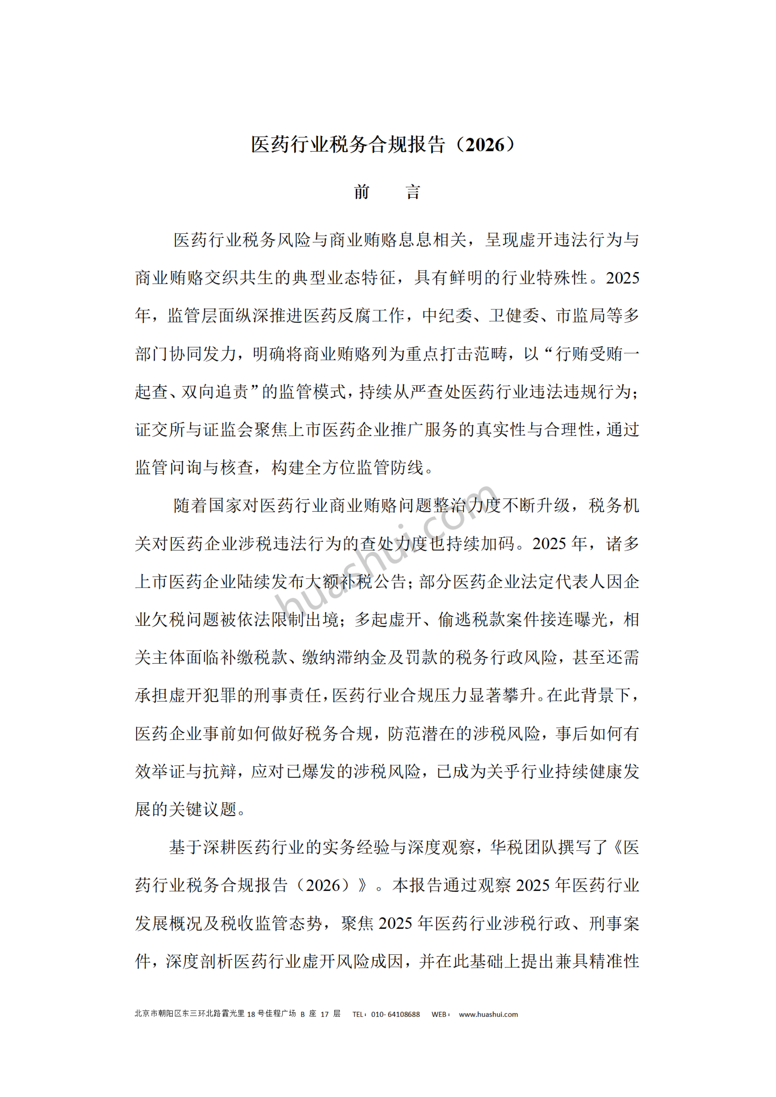 基于深耕医药行业的实务经验与深度观察,华税团队撰写了《医药行业税务合规报告(2026)》。本报告通过观察2025年医药行业发展概况及税收监管态势,聚焦2025年医药行业涉税行政、刑事案件,深度剖析医药行业虚开风险成因,并在此基础上提出兼具精准性与可操作性的涉税风险化解与应对策略,以期为医药行业的税务合规建设与高质量发展提供有益启示与实践参考。