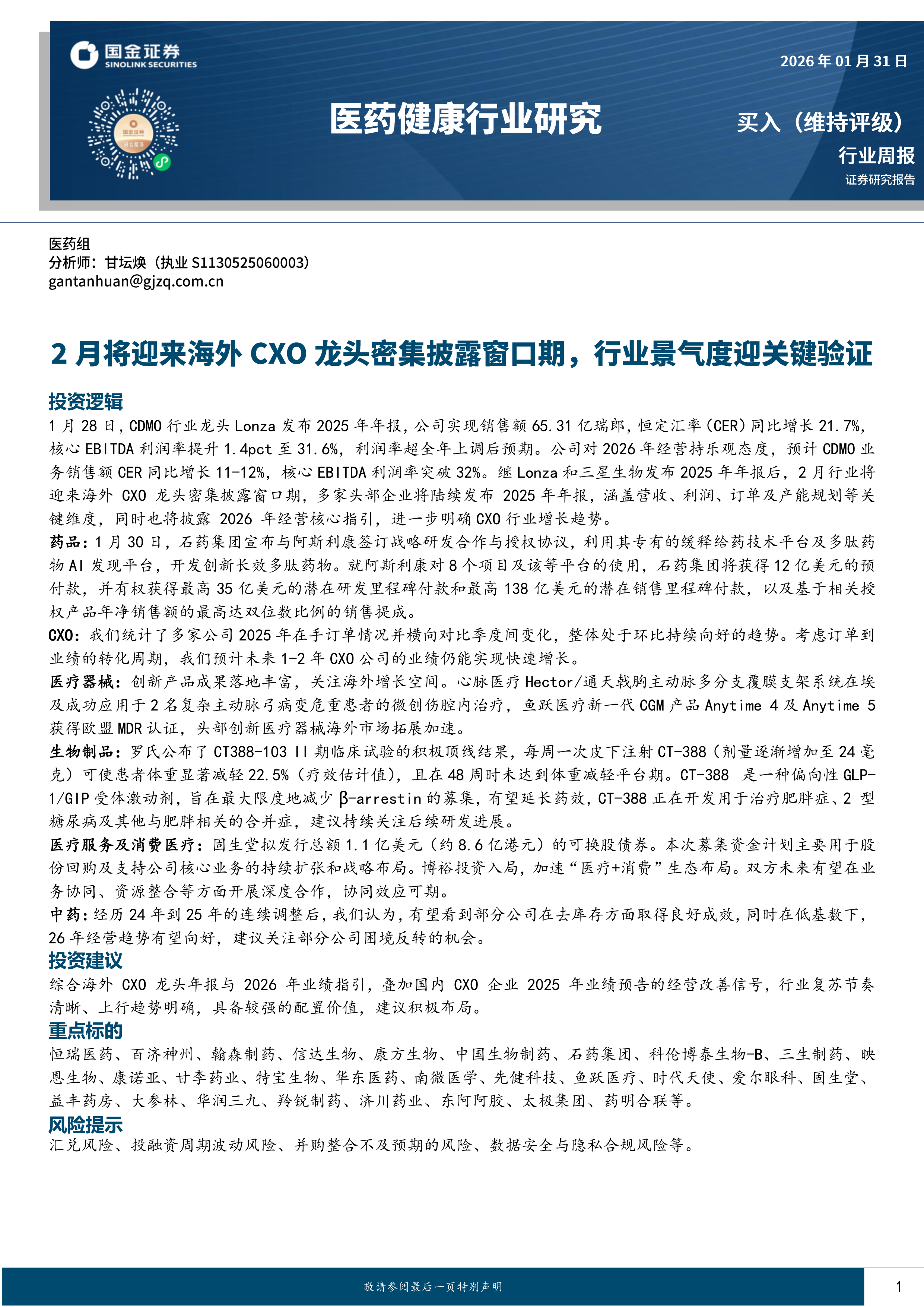综合海外CXO龙头年报与2026年业绩指引,叠加国内CXO企业2025年业绩预告的经营改善信号,行业复苏节奏清晰、上行趋势明确,具备较强的配置价值,建议积极布局。