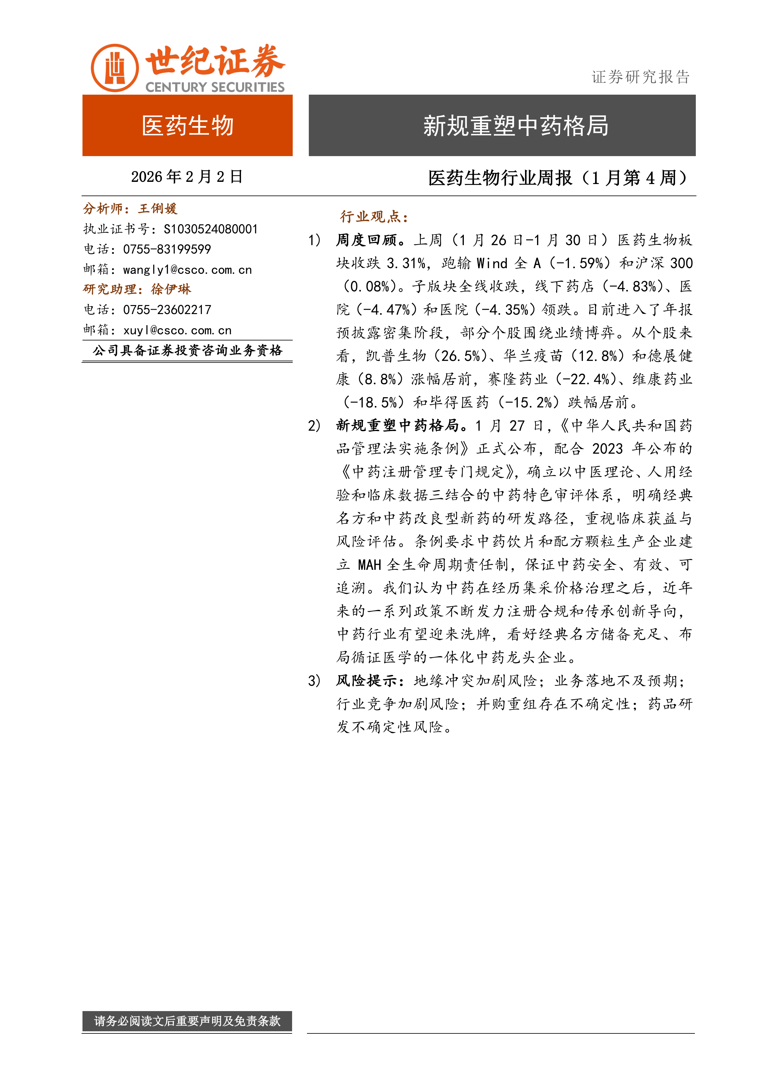 医药生物行业周报(1月第4周):新规重塑中药格局