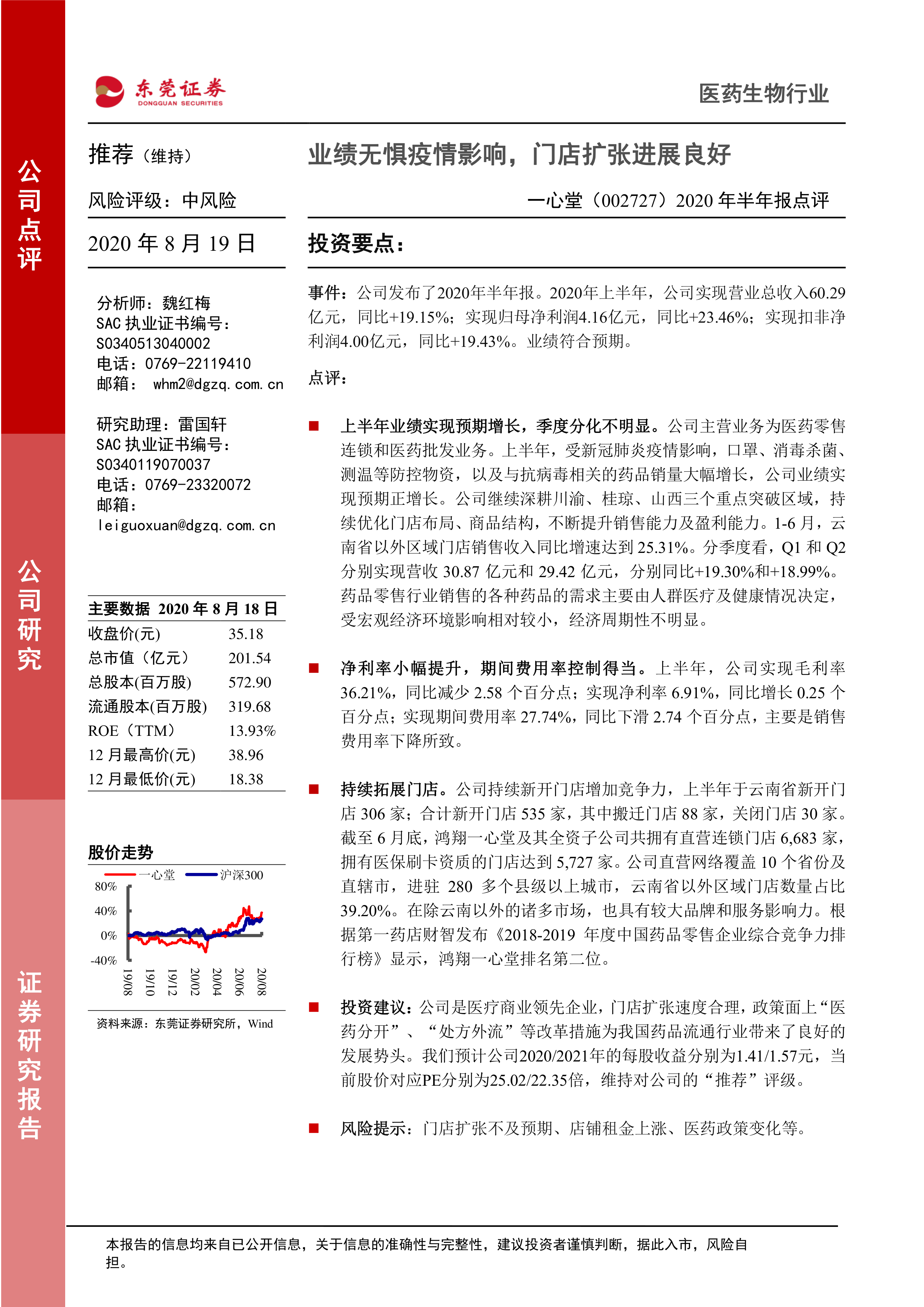 2020年半年报点评:业绩无惧疫情影响,门店扩张进展良好