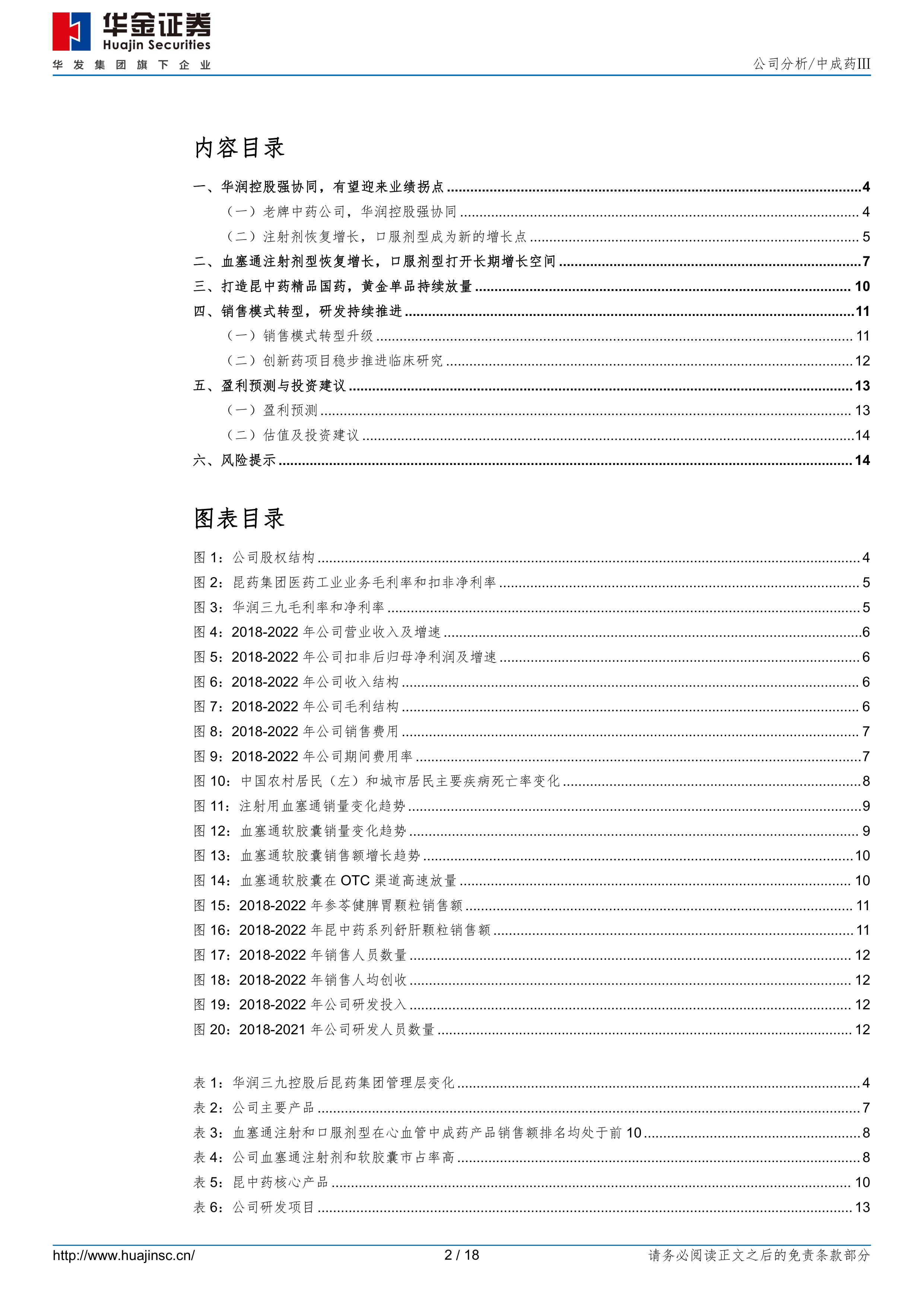 昆中药品牌知名度高, 黄金单品快速放量。 昆中药有 600 多年历史, 是我国五大中药老号之一, 拥有药品批准文号 143 个, 独家产品 21 个。 公司致力于打造“黄金单品+品类集群” 的核心产品群。 核心产品参苓健脾胃颗粒、 香砂平胃颗粒、 舒肝颗粒在 2019-2022 年期间的复合增速分别为 39%、 34%、 19%。 公司大力布局 OTC渠道, 未来还有望借助华润三九的 OTC 渠道打造全国品牌, 推动产品高速放量。