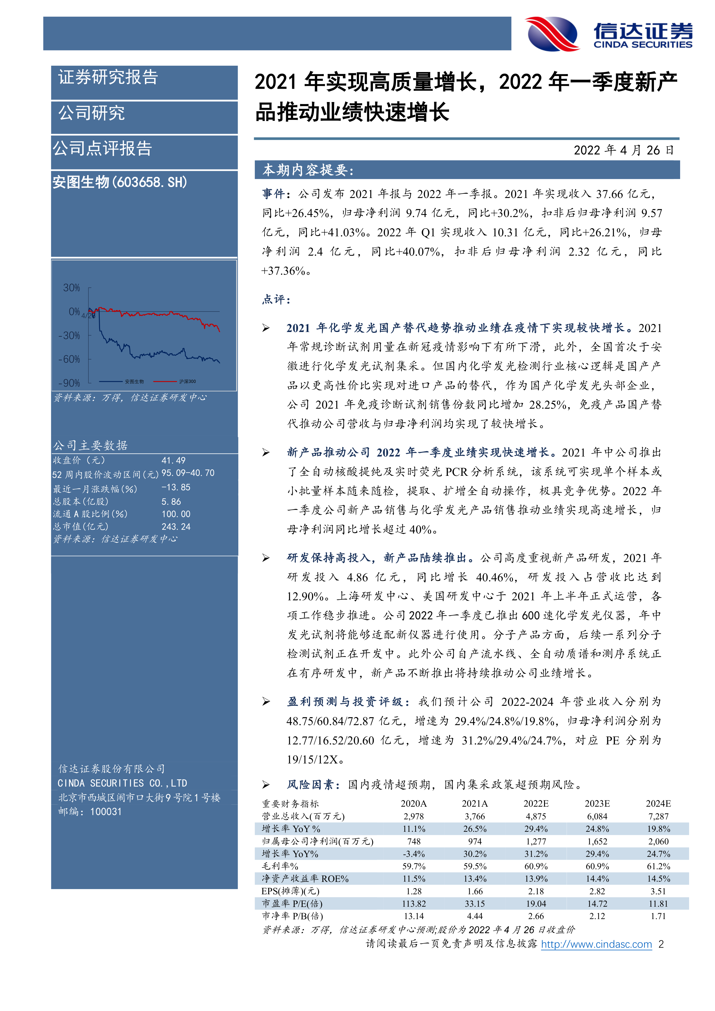 新产品推动公司 2022 年一季度业绩实现快速增长。 2021 年中公司推出了全自动核酸提纯及实时荧光 PCR 分析系统, 该系统可实现单个样本或小批量样本随来随检,提取、扩增全自动操作, 极具竞争优势。 2022 年一季度公司新产品销售与化学发光产品销售推动业绩实现高速增长,归母净利润同比增长超过 40%。