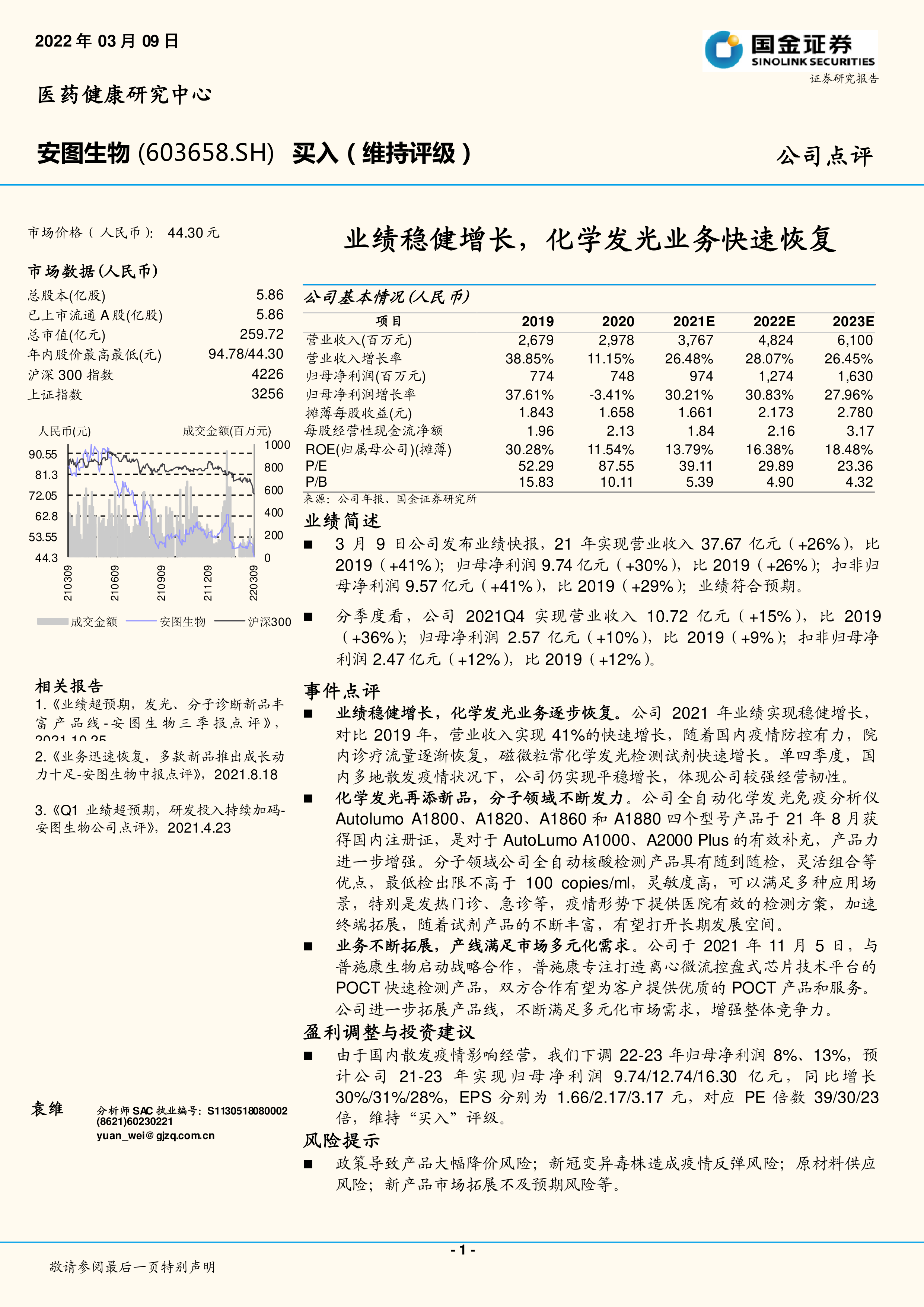 业绩稳健增长,化学发光业务逐步恢复。公司2021年业绩实现稳健增长,对比2019年,营业收入实现41%的快速增长,随着国内疫情防控有力,院内诊疗流量逐渐恢复,磁微粒常化学发光检测试剂快速增长。单四季度,国内多地散发疫情状况下,公司仍实现平稳增长,体现公司较强经营韧性。