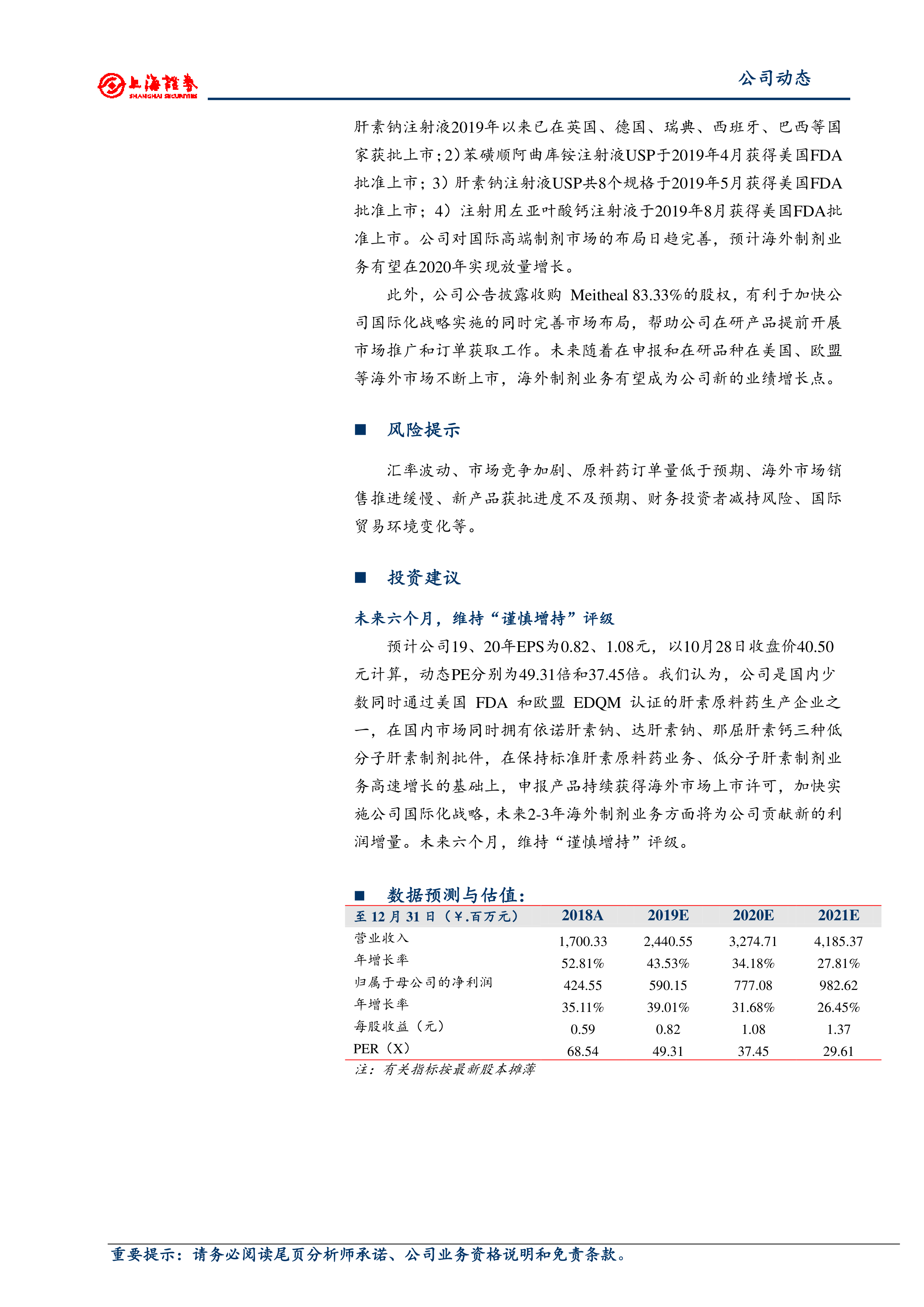 业绩持续快速增长 推进海外制剂业务布局