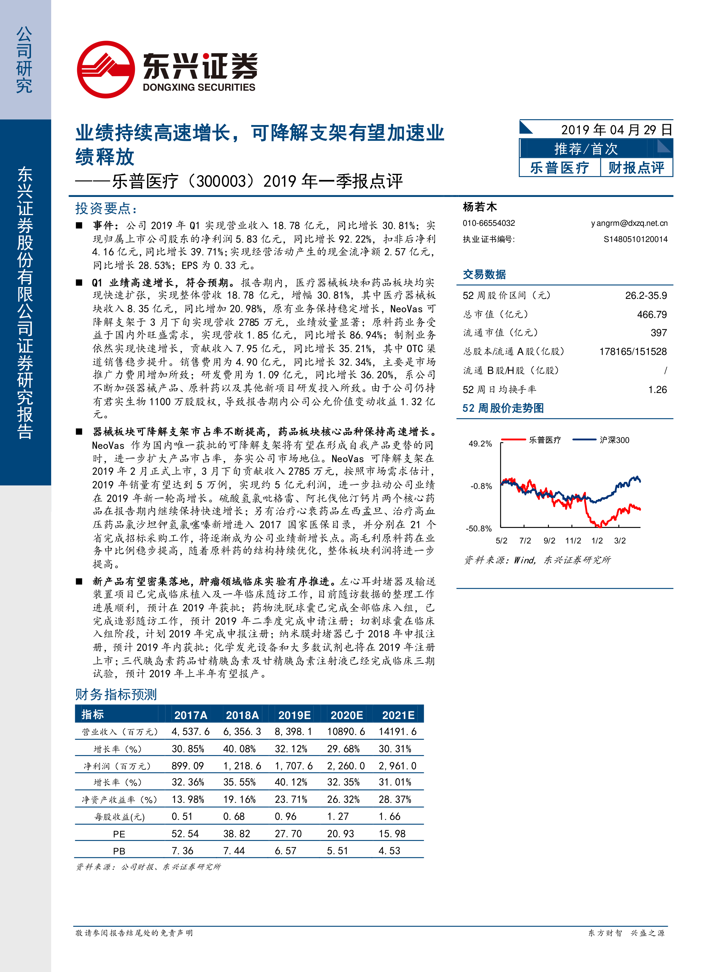 2019年一季报点评:业绩持续高速增长,可降解支架有望加速业绩释放