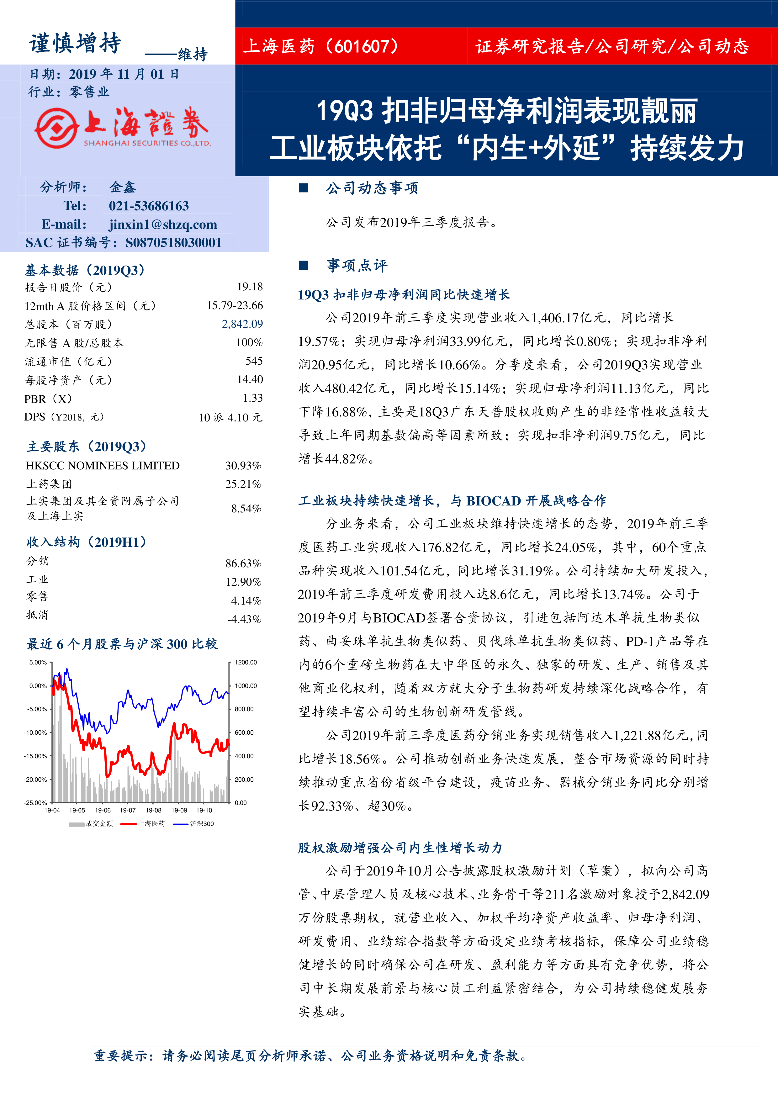 19Q3扣非归母净利润表现靓丽 工业板块依托“内生+外延”持续发力