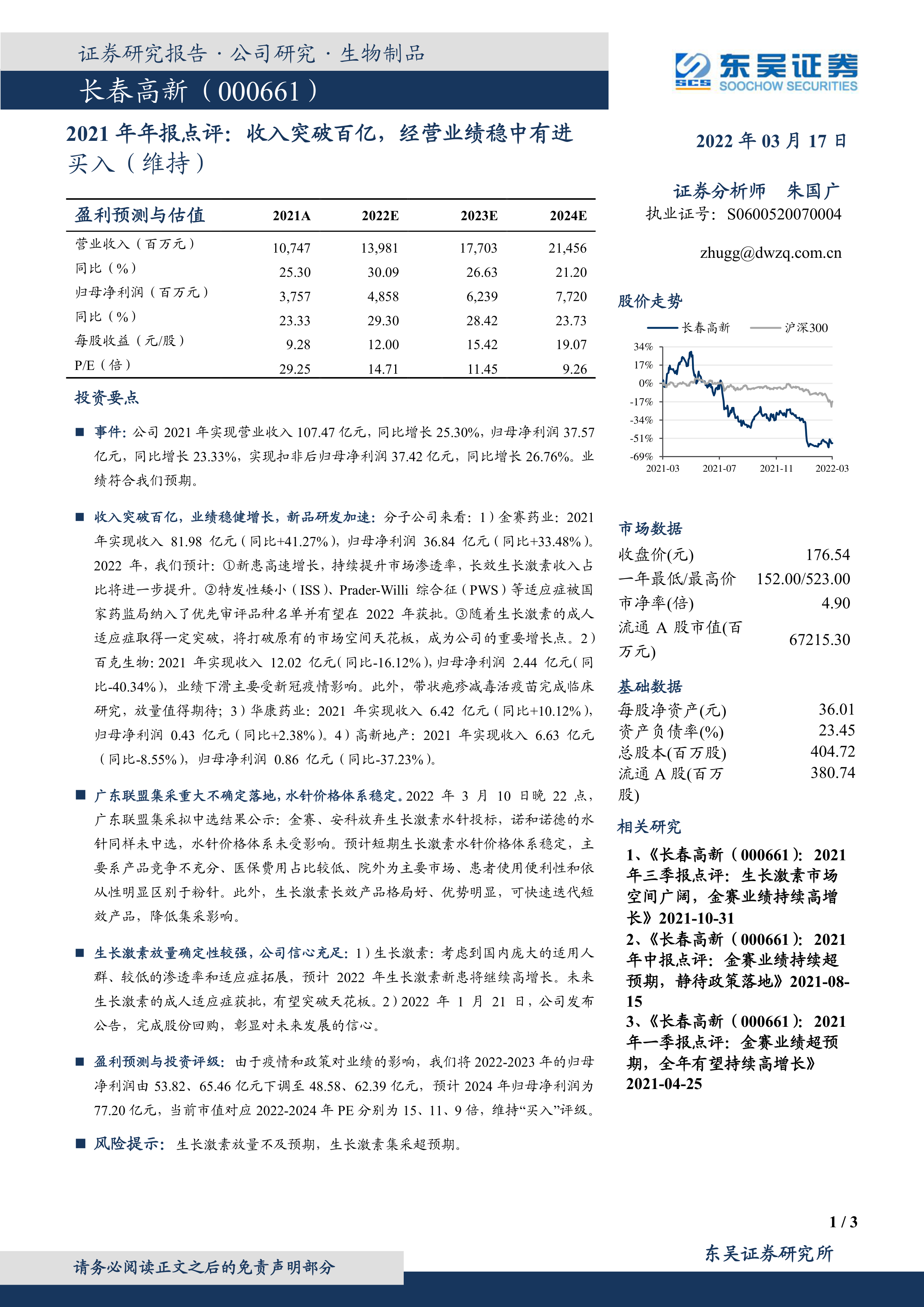 收入突破百亿,业绩稳健增长,新品研发加速:分子公司来看:1)金赛药业:2021年实现收入81.98亿元(同比+41.27%),归母净利润36.84亿元(同比+33.48%)。2022年,我们预计:①新患高速增长,持续提升市场渗透率,长效生长激素收入占比将进一步提升。②特发性矮小(ISS)、Prader-Willi综合征(PWS)等适应症被国家药监局纳入了优先审评品种名单并有望在2022年获批。③随着生长激素的成人适应症取得一定突破,将打破原有的市场空间天花板,成为公司的重要增长点。2)百克生物:2021年实现收入12.02亿元(同比-16.12%),归母净利润2.44亿元(同比-40.34%),业绩下滑主要受新冠疫情影响。此外,带状疱疹减毒活疫苗完成临床研究,放量值得期待;3)华康药业:2021年实现收入6.42亿元(同比+10.12%),归母净利润0.43亿元(同比+2.38%)。4)高新地产:2021年实现收入6.63亿元(同比-8.55%),归母净利润0.86亿元(同比-37.23%)。