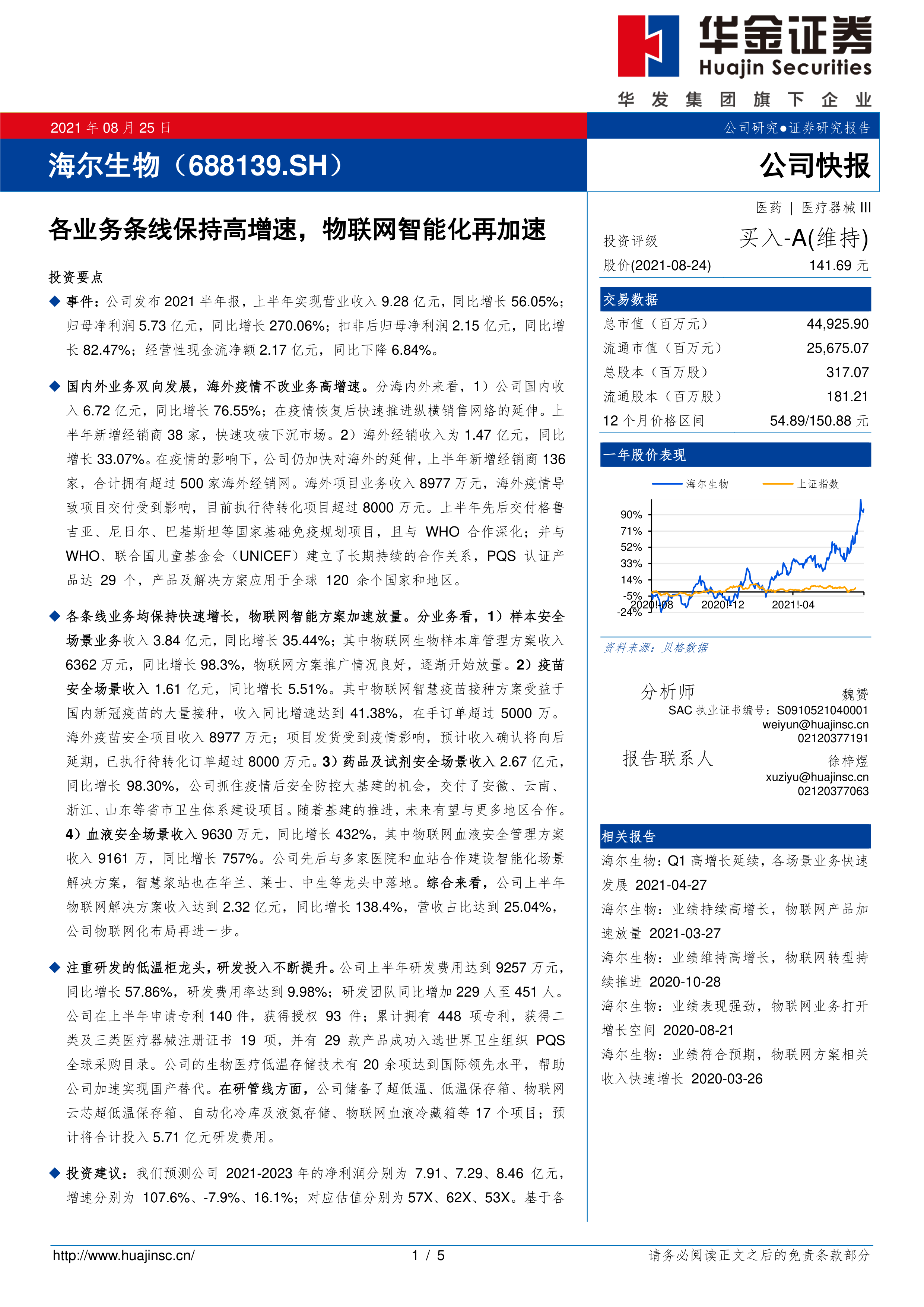 各条线业务均保持快速增长,物联网智能方案加速放量。分业务看,1)样本安全场景业务收入 3.84 亿元,同比增长 35.44%;其中物联网生物样本库管理方案收入6362 万元,同比增长 98.3%,物联网方案推广情况良好,逐渐开始放量。2)疫苗安全场景收入 1.61 亿元,同比增长 5.51%。其中物联网智慧疫苗接种方案受益于国内新冠疫苗的大量接种,收入同比增速达到 41.38%,在手订单超过 5000 万。海外疫苗安全项目收入 8977 万元;项目发货受到疫情影响,预计收入确认将向后延期,已执行待转化订单超过 8000 万元。 3)药品及试剂安全场景收入 2.67 亿元,同比增长 98.30%,公司抓住疫情后安全防控大基建的机会,交付了安徽、云南、浙江、山东等省市卫生体系建设项目。随着基建的推进,未来有望与更多地区合作。4)血液安全场景收入 9630 万元,同比增长 432%,其中物联网血液安全管理方案收入 9161 万,同比增长 757%。公司先后与多家医院和血站合作建设智能化场景解决方案,智慧浆站也在华兰、莱士、中生等龙头中落地。综合来看,公司上半年物联网解决方案收入达到 2.32 亿元,同比增长 138.4%,营收占比达到 25.04%,公司物联网化布局再进一步。