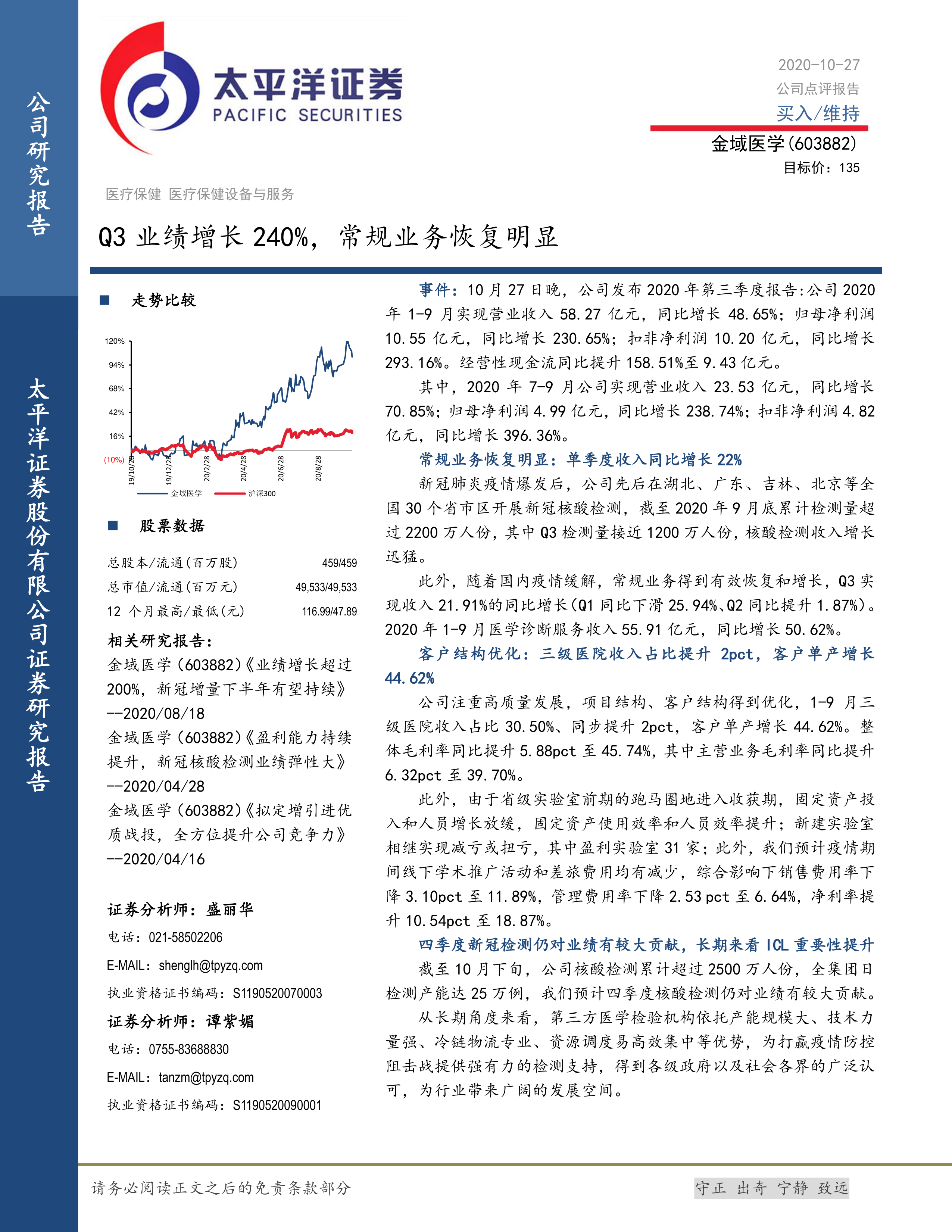 Q3业绩增长240%,常规业务恢复明显