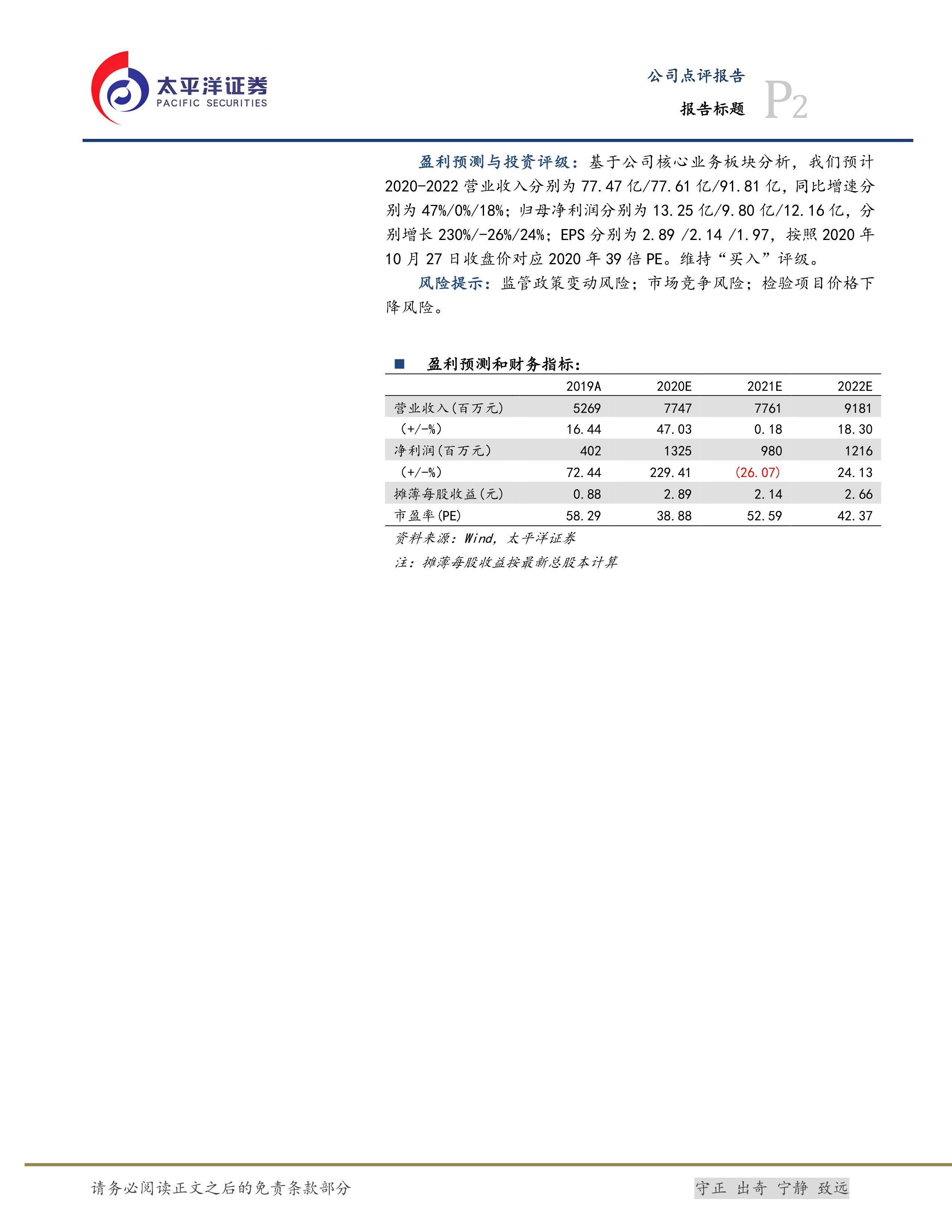 盈利预测与投资评级:基于公司核心业务板块分析,我们预计2020-2022营业收入分别为77.47亿/77.61亿/91.81亿,同比增速分别为47%/0%/18%;归母净利润分别为13.25亿/9.80亿/12.16亿,分别增长230%/-26%/24%;EPS分别为2.89/2.14/1.97,按照2020年10月27日收盘价对应2020年39倍PE。维持“买入”评级。