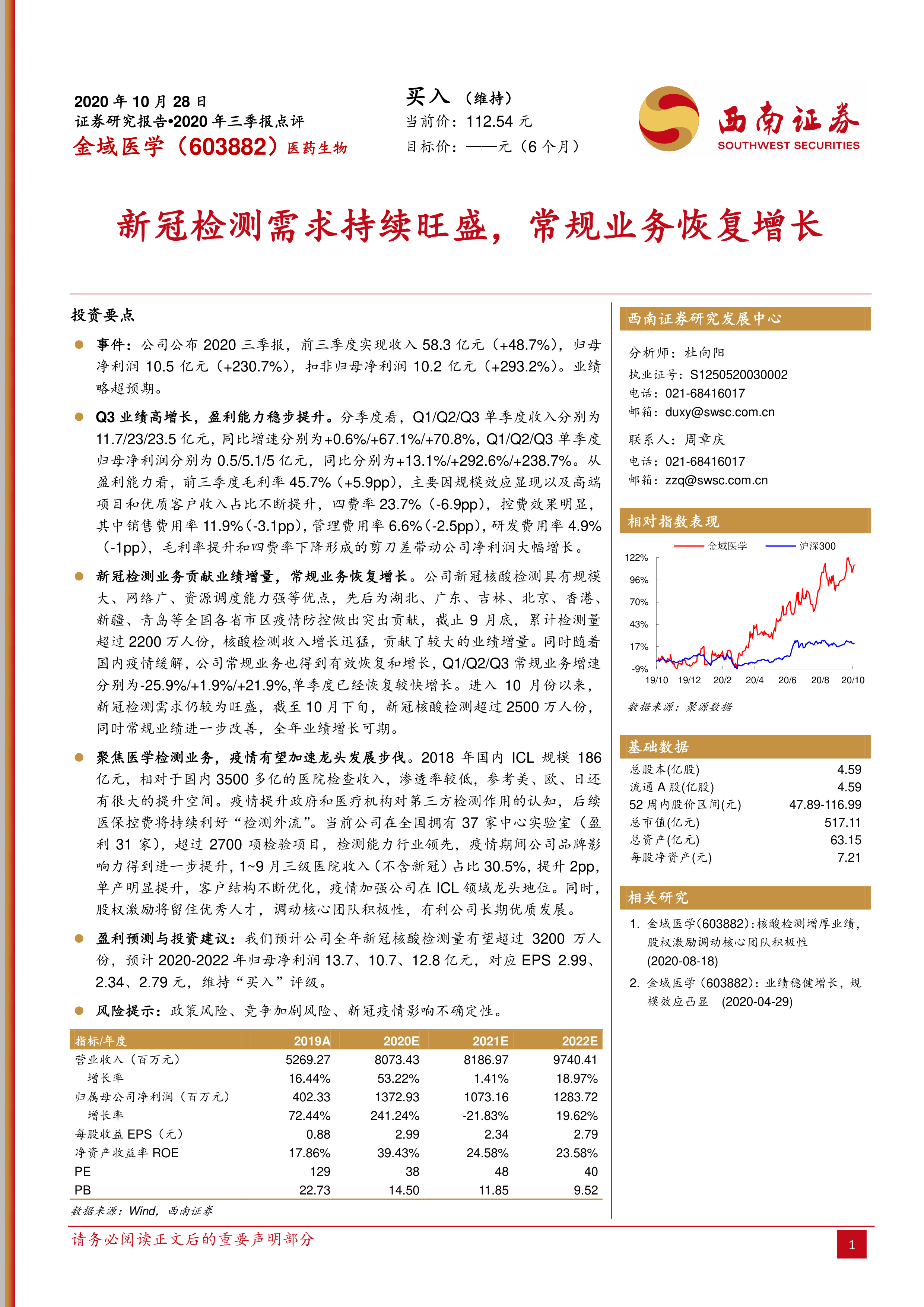 盈利预测与投资建议: 我们预计公司全年新冠核酸检测量有望超过 3200 万人份, 预计 2020-2022 年归母净利润 13.7、 10.7、 12.8 亿元, 对应 EPS 2.99、2.34、 2.79 元, 维持“买入”评级。