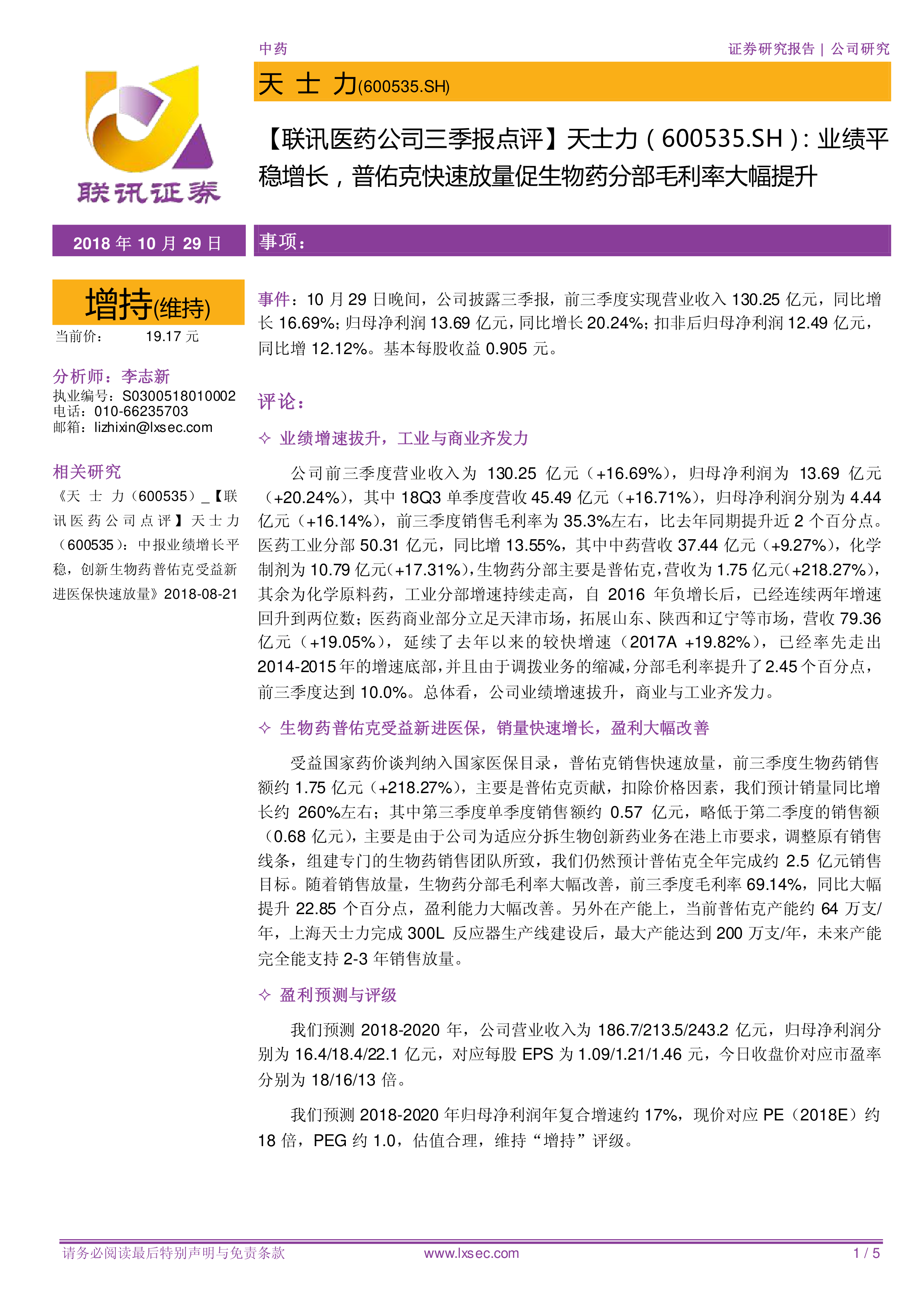 【联讯医药公司三季报点评】天士力:业绩平稳增长,普佑克快速放量促生物药分部毛利率大幅提升