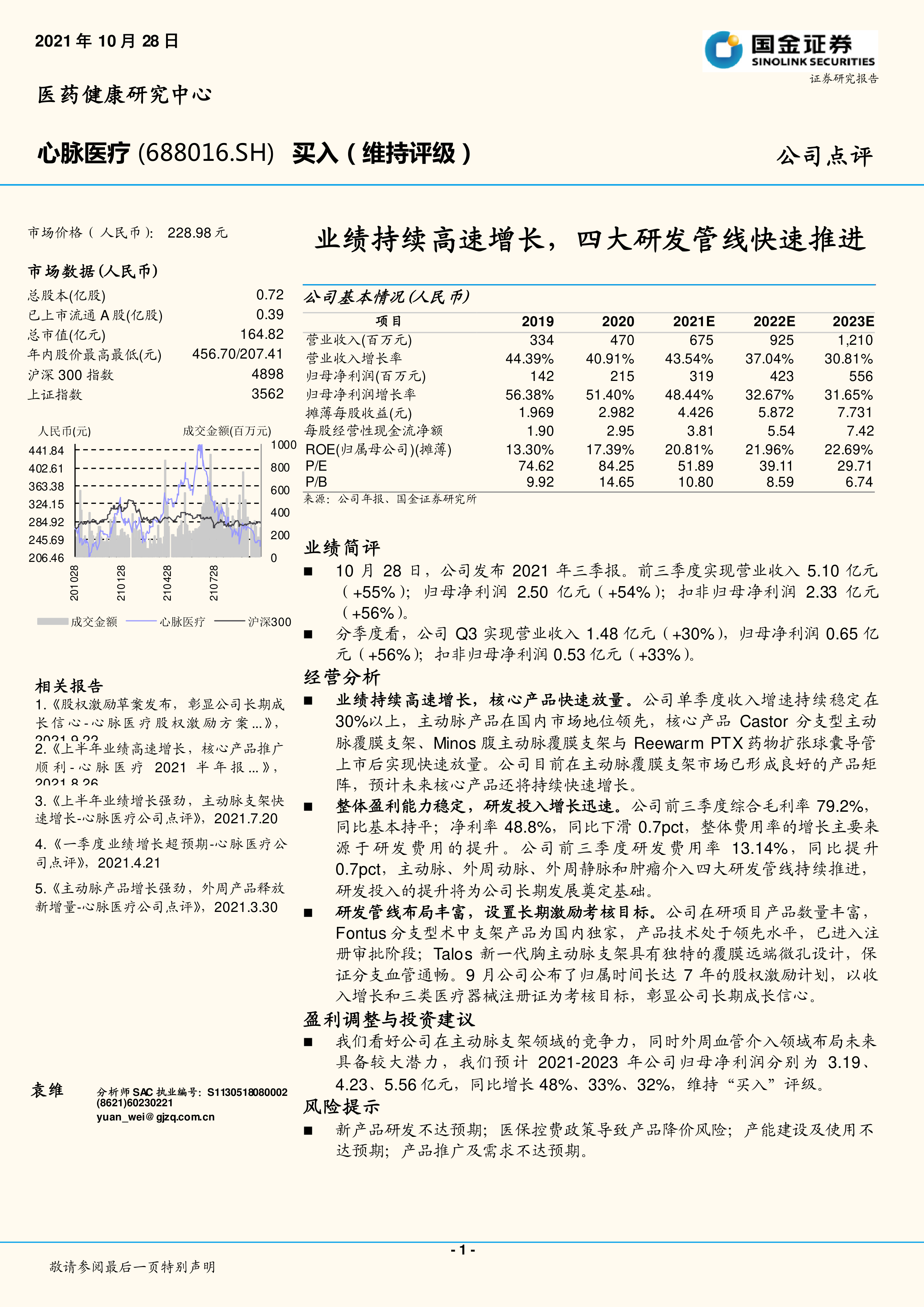 我们看好公司在主动脉支架领域的竞争力,同时外周血管介入领域布局未来具备较大潜力,我们预计2021-2023年公司归母净利润分别为3.19、4.23、5.56亿元,同比增长48%、33%、32%,维持“买入”评级。