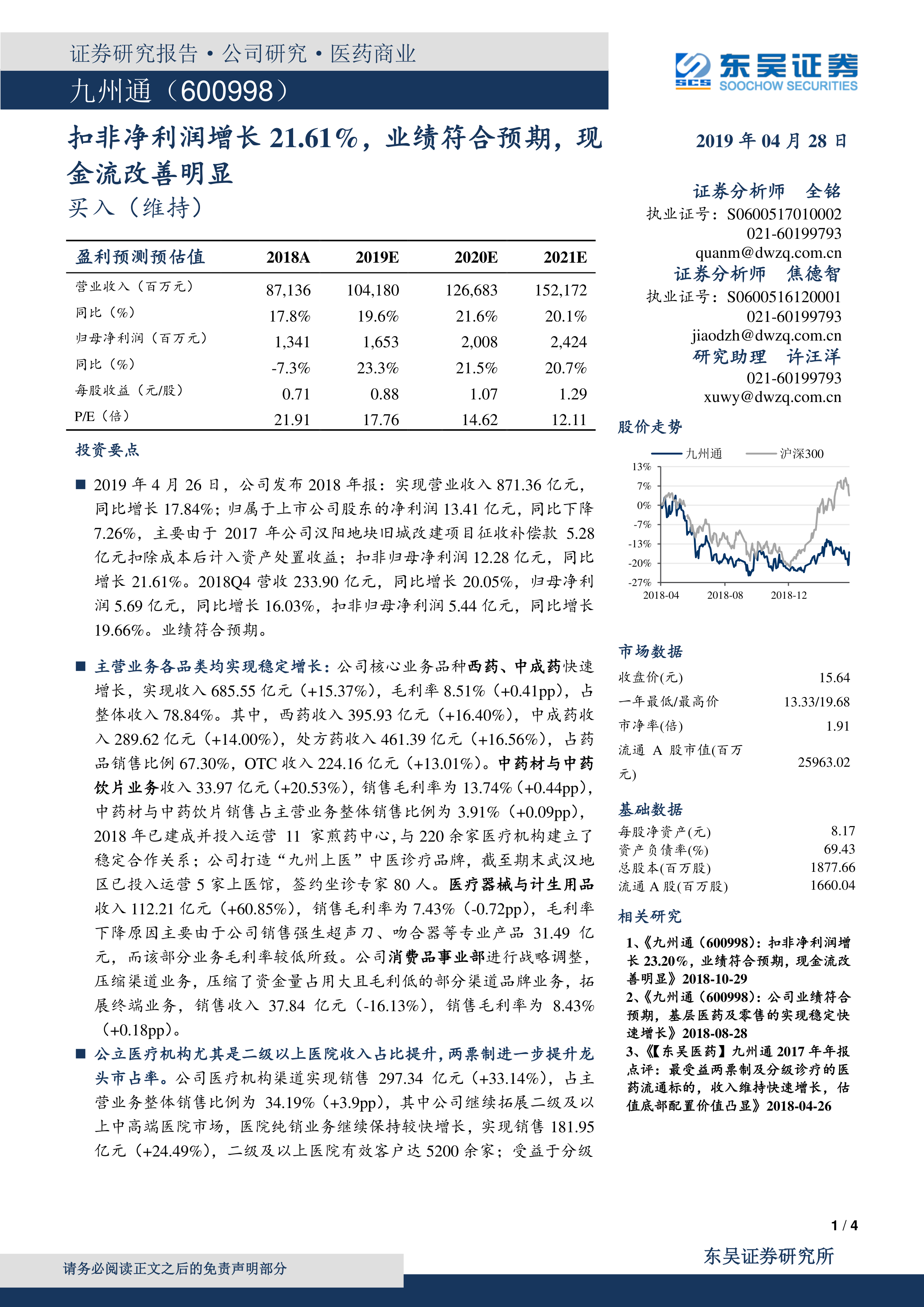 扣非净利润增长21.61%,业绩符合预期,现金流改善明显