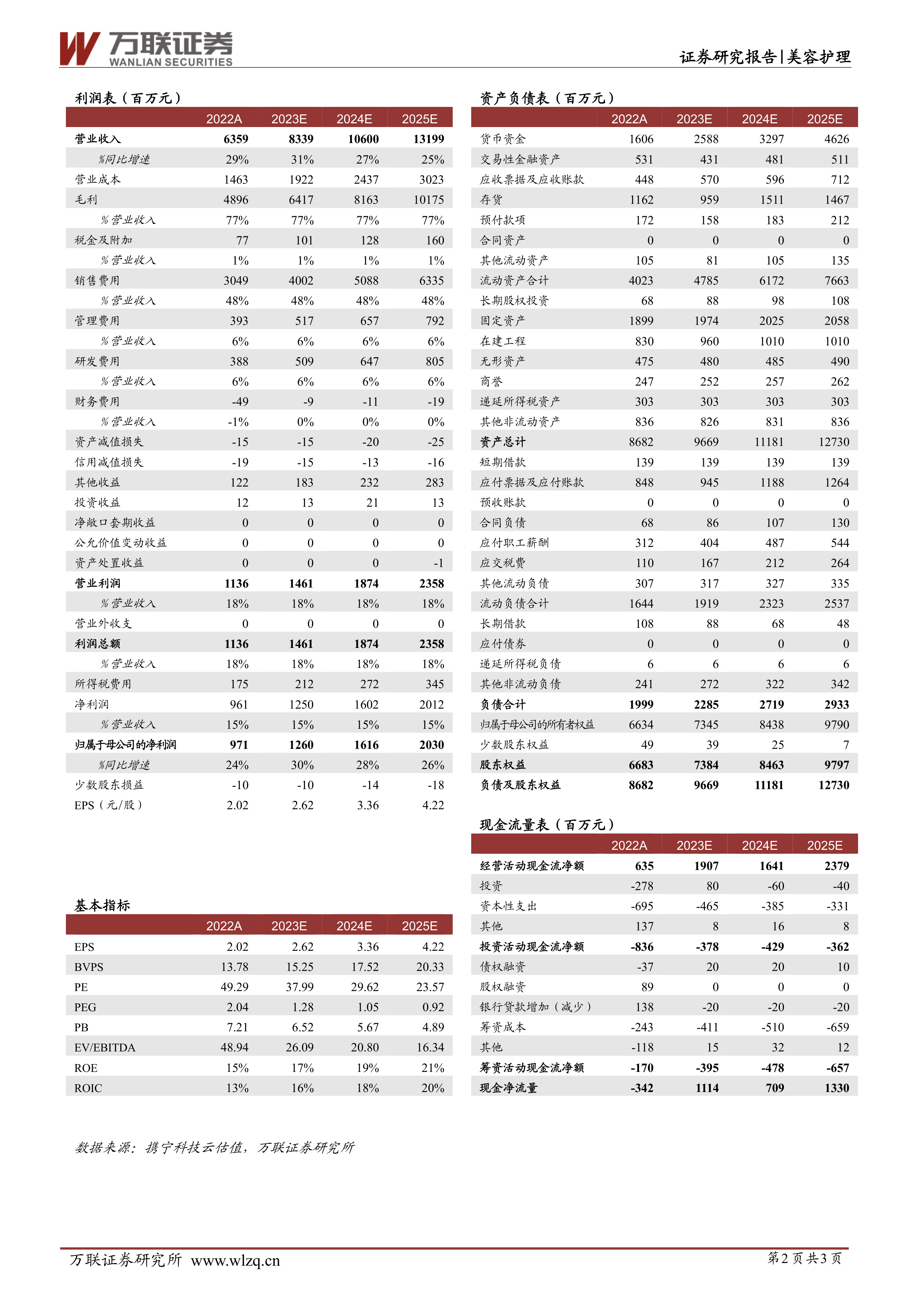 稳步推进“四轮驱动”业务布局。原料业务:2023年将重点关注新业务领域和海外市场的拓展。产能方面,东营佛思特工厂无菌HA生产线预计将实现生产。医疗终端业务:医美业务方面,预计医美终端业务将逐步恢复,产品规划和布局进一步完善。医药业务方面,2023年公司将继续深耕骨科、眼科市场,预计医药业务维持稳定增长。功能性护肤品业务:品牌继续差异化定位,做大品牌内容中台,数字化运营全面赋能,提升大单品运营效率。功能性食品业务:水肌泉提升运营效率,加强抖音自播建设;黑零进一步丰富产品矩阵;休想角落升级产品配方,提升复购率。