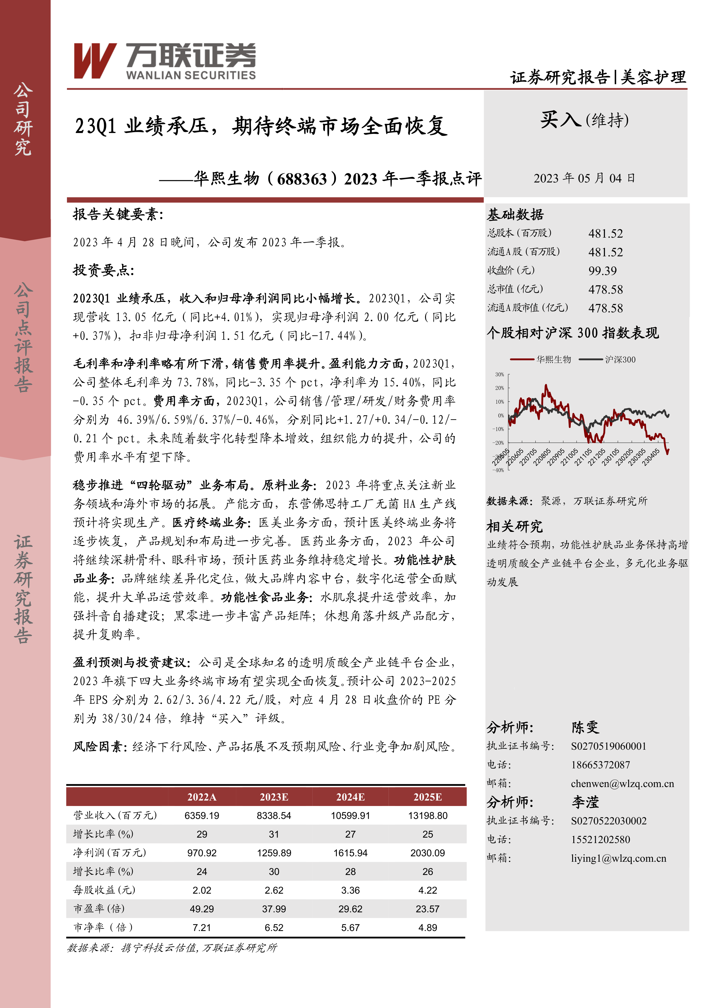 盈利预测与投资建议:公司是全球知名的透明质酸全产业链平台企业,2023年旗下四大业务终端市场有望实现全面恢复。预计公司2023-2025年EPS分别为2.62/3.36/4.22元/股,对应4月28日收盘价的PE分别为38/30/24倍,维持“买入”评级。