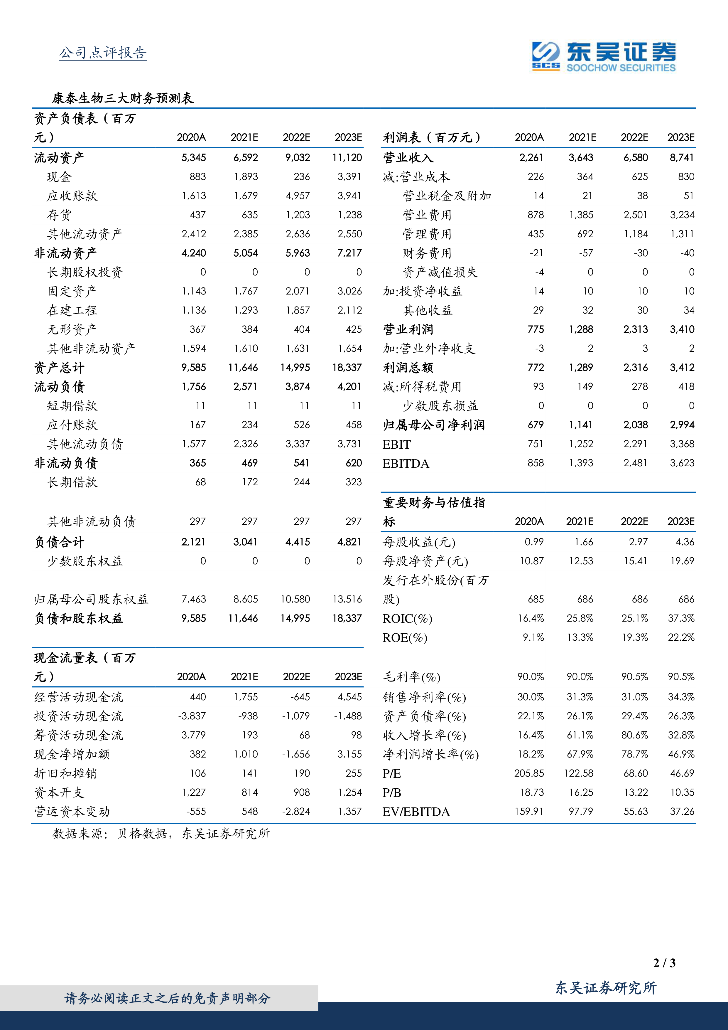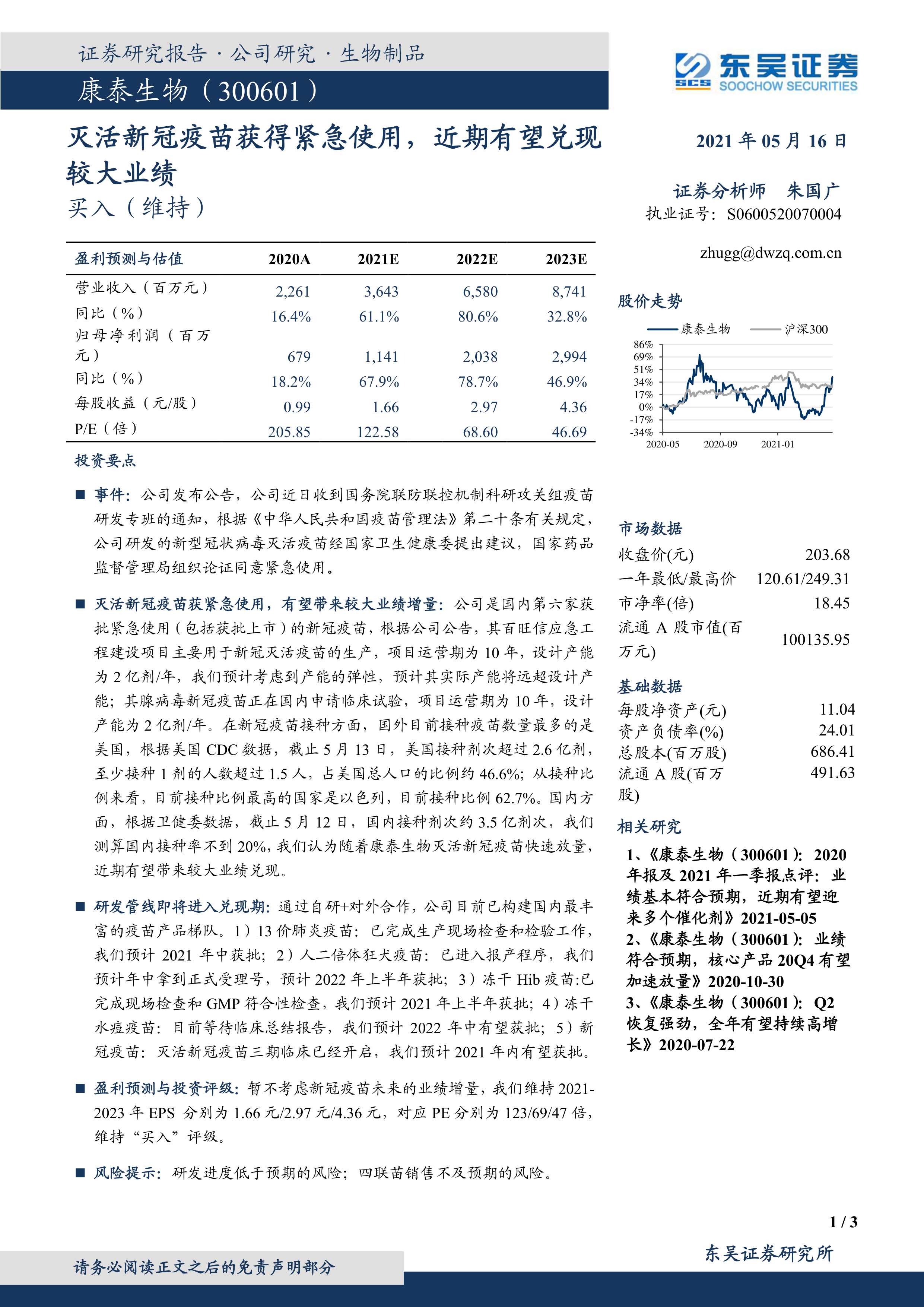 盈利预测与投资评级:暂不考虑新冠疫苗未来的业绩增量,我们维持2021-2023年EPS分别为1.66元/2.97元/4.36元,对应PE分别为123/69/47倍,维持“买入”评级。
