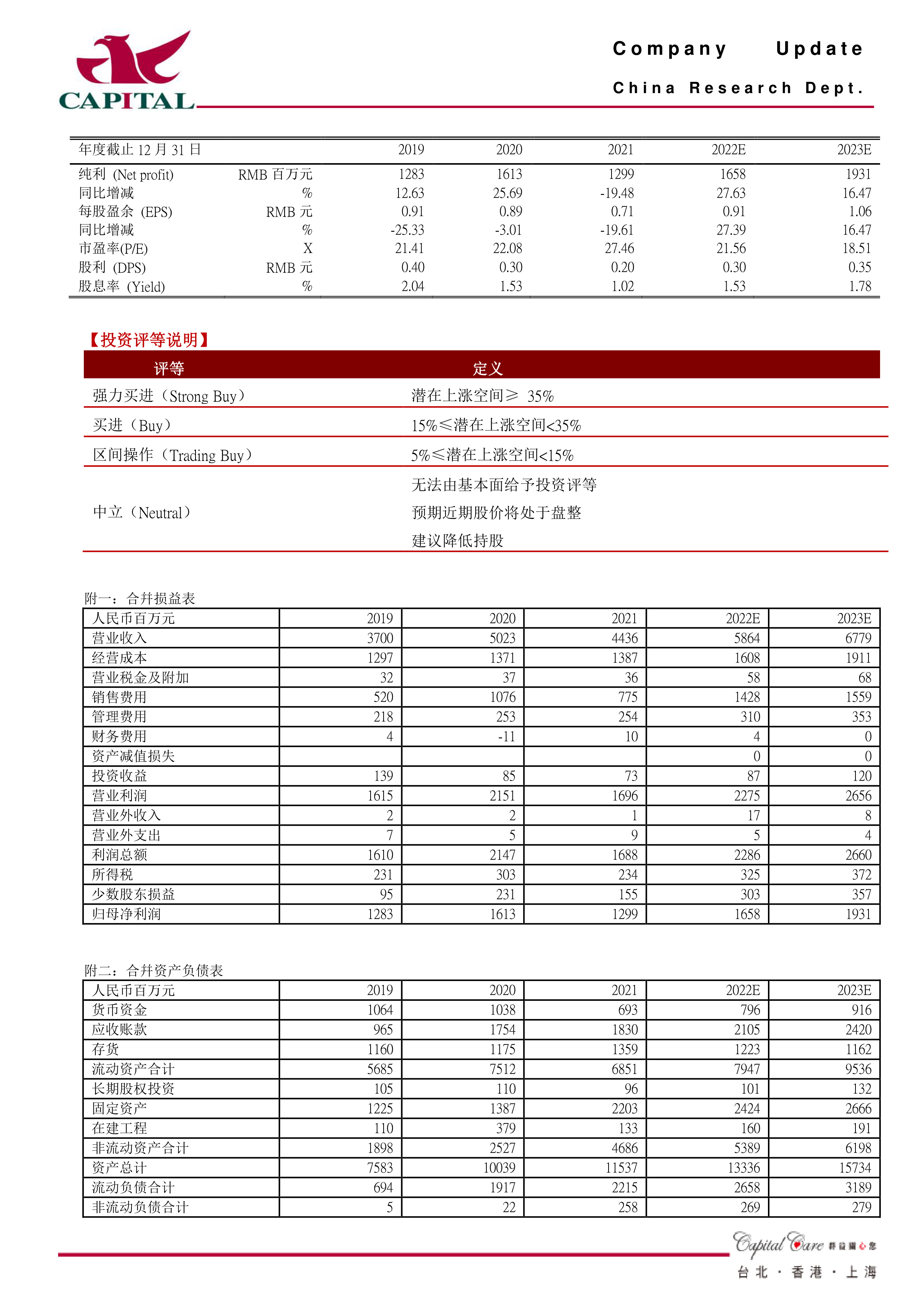 盈利预测及投资建议: 考虑到疫苗需求增加好于预期, 我们上调盈利预测。 我们预计公司 2022/2023 年分别录得净利润 16.6 亿元、 19.3 亿元,YOY+27.6%、 +16.5% (原预计公司 2022/2023 年分别录得净利润 14.2 亿元、16.5 亿元, YOY+9.4%、 +16.3%) EPS 分别为 0.9 元和 1.1 元,对应 PE 分别为 22X、 19X,疫苗推动业绩快速增长,血站产能增加,上调至“买进”评级