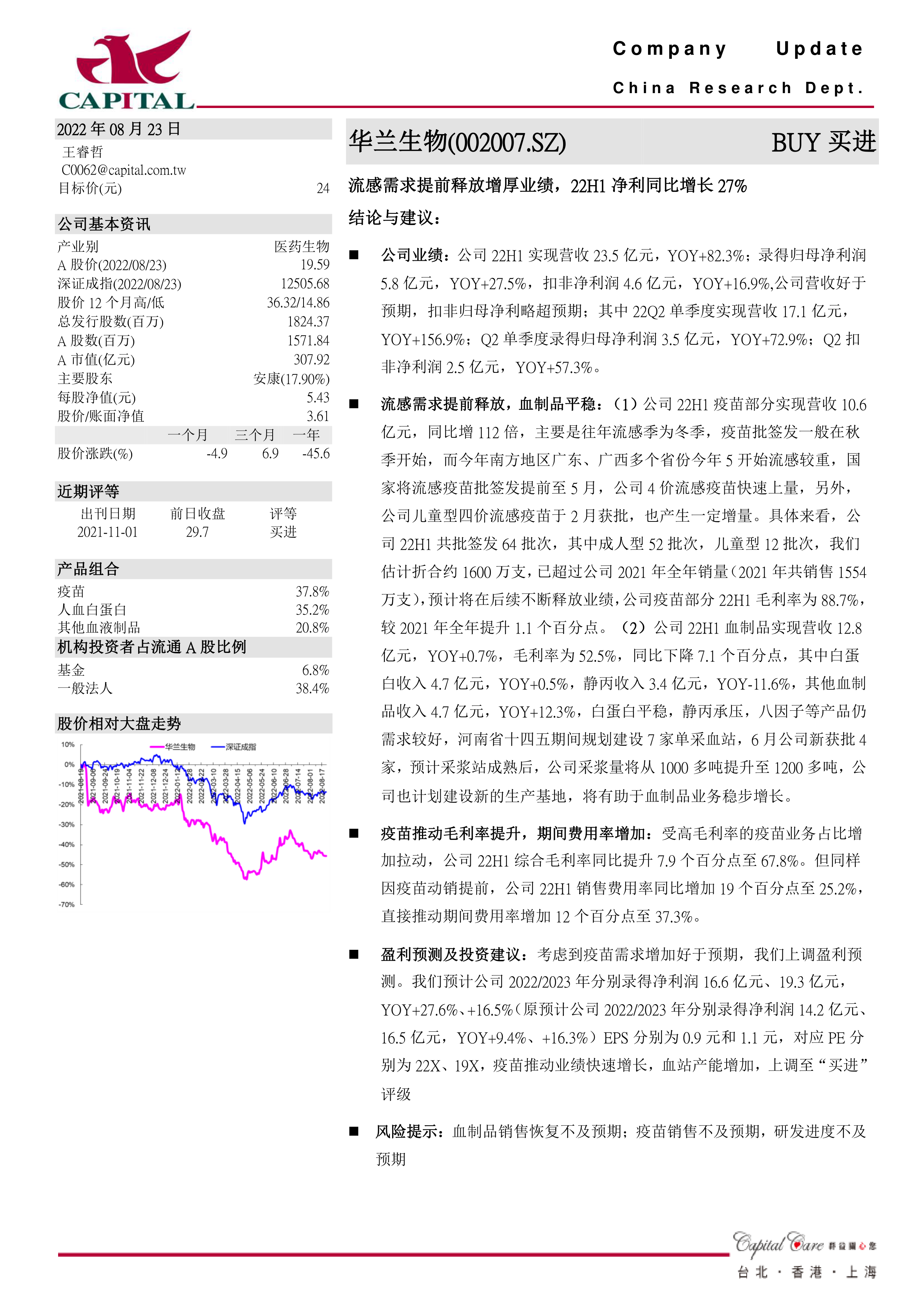 流感需求提前释放,血制品平稳: ( 1) 公司 22H1 疫苗部分实现营收 10.6亿元,同比增 112 倍, 主要是往年流感季为冬季,疫苗批签发一般在秋季开始, 而今年南方地区广东、广西多个省份今年 5 开始流感较重, 国家将流感疫苗批签发提前至 5 月,公司 4 价流感疫苗快速上量,另外,公司儿童型四价流感疫苗于 2 月获批,也产生一定增量。 具体来看,公司 22H1 共批签发 64 批次, 其中成人型 52 批次, 儿童型 12 批次, 我们估计折合约 1600 万支,已超过公司 2021 年全年销量 ( 2021 年共销售 1554万支),预计将在后续不断释放业绩,公司疫苗部分 22H1 毛利率为 88.7%,较 2021 年全年提升 1.1 个百分点。 ( 2) 公司 22H1 血制品实现营收 12.8亿元, YOY+0.7%, 毛利率为 52.5%, 同比下降 7.1 个百分点,其中白蛋白收入 4.7 亿元, YOY+0.5%,静丙收入 3.4 亿元, YOY-11.6%, 其他血制品收入 4.7 亿元, YOY+12.3%,白蛋白平稳,静丙承压,八因子等产品仍需求较好,河南省十四五期间规划建设 7 家单采血站, 6 月公司新获批 4家,预计采浆站成熟后,公司采浆量将从 1000 多吨提升至 1200 多吨, 公司也计划建设新的生产基地, 将有助于血制品业务稳步增长。
