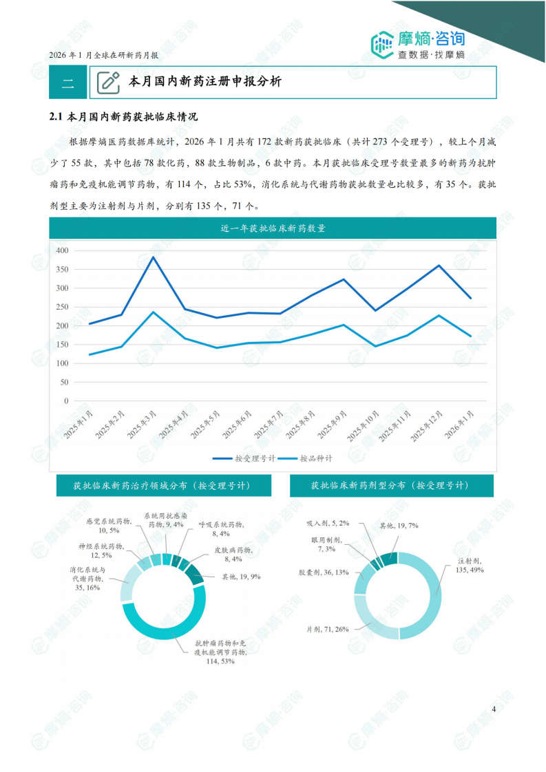 根据摩熵医药数据库统计,2026年1月共有172款新药获批临床(共计273个受理号),较上个月减少了55款,其中包括78款化药,88款生物制品,6款中药。本月获批临床受理号数量最多的新药为抗肿瘤药和免疫机能调节药物,有114个,占比53%,消化系统与代谢药物获批数量也比较多,有35个。获批剂型主要为注射剂与片剂,分别有135个,71个。