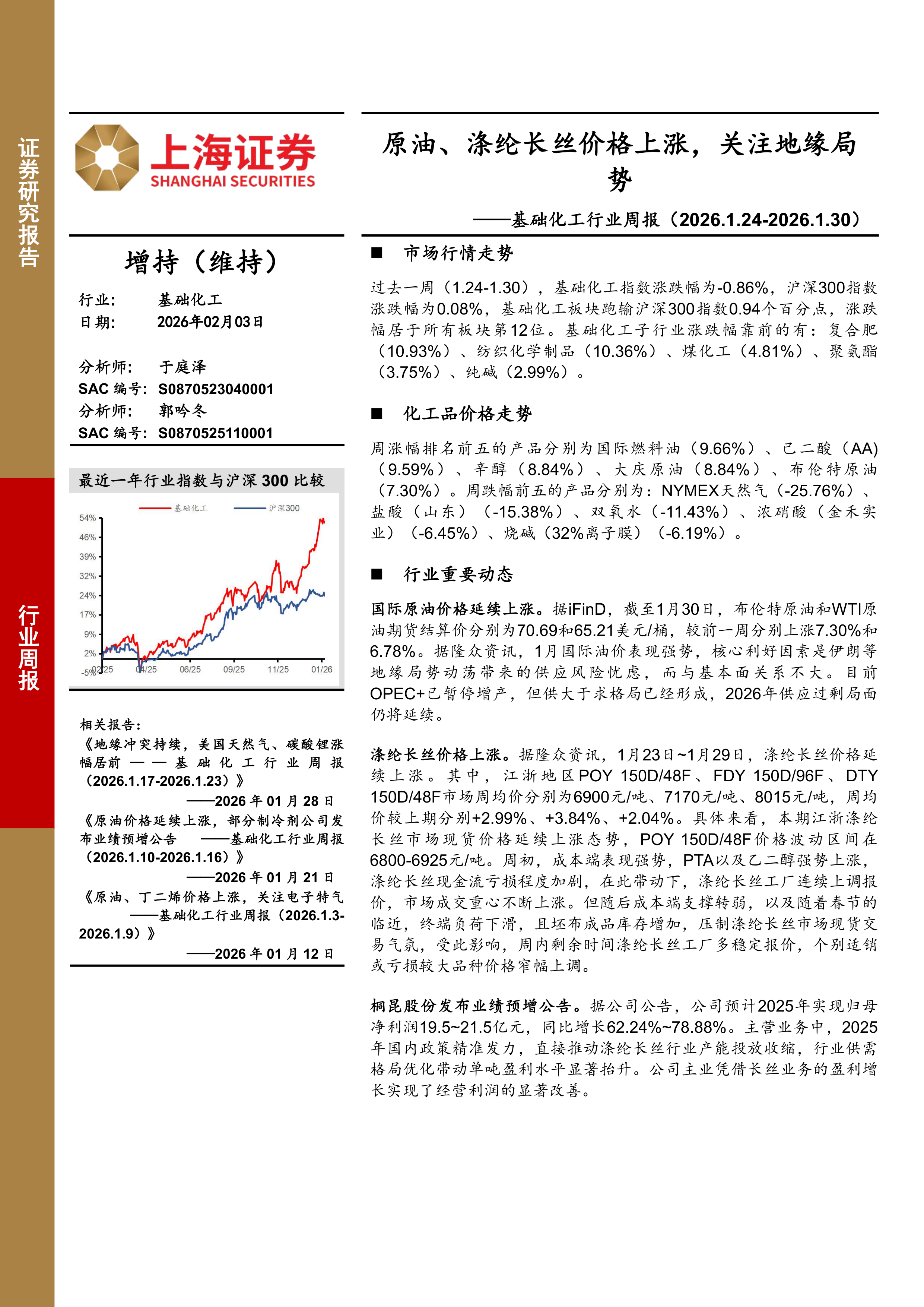国际原油价格延续上涨。据iFinD,截至1月30日,布伦特原油和WTI原油期货结算价分别为70.69和65.21美元/桶,较前一周分别上涨7.30%和6.78%。据隆众资讯,1月国际油价表现强势,核心利好因素是伊朗等地缘局势动荡带来的供应风险忧虑,而与基本面关系不大。目前OPEC+已暂停增产,但供大于求格局已经形成,2026年供应过剩局面仍将延续。