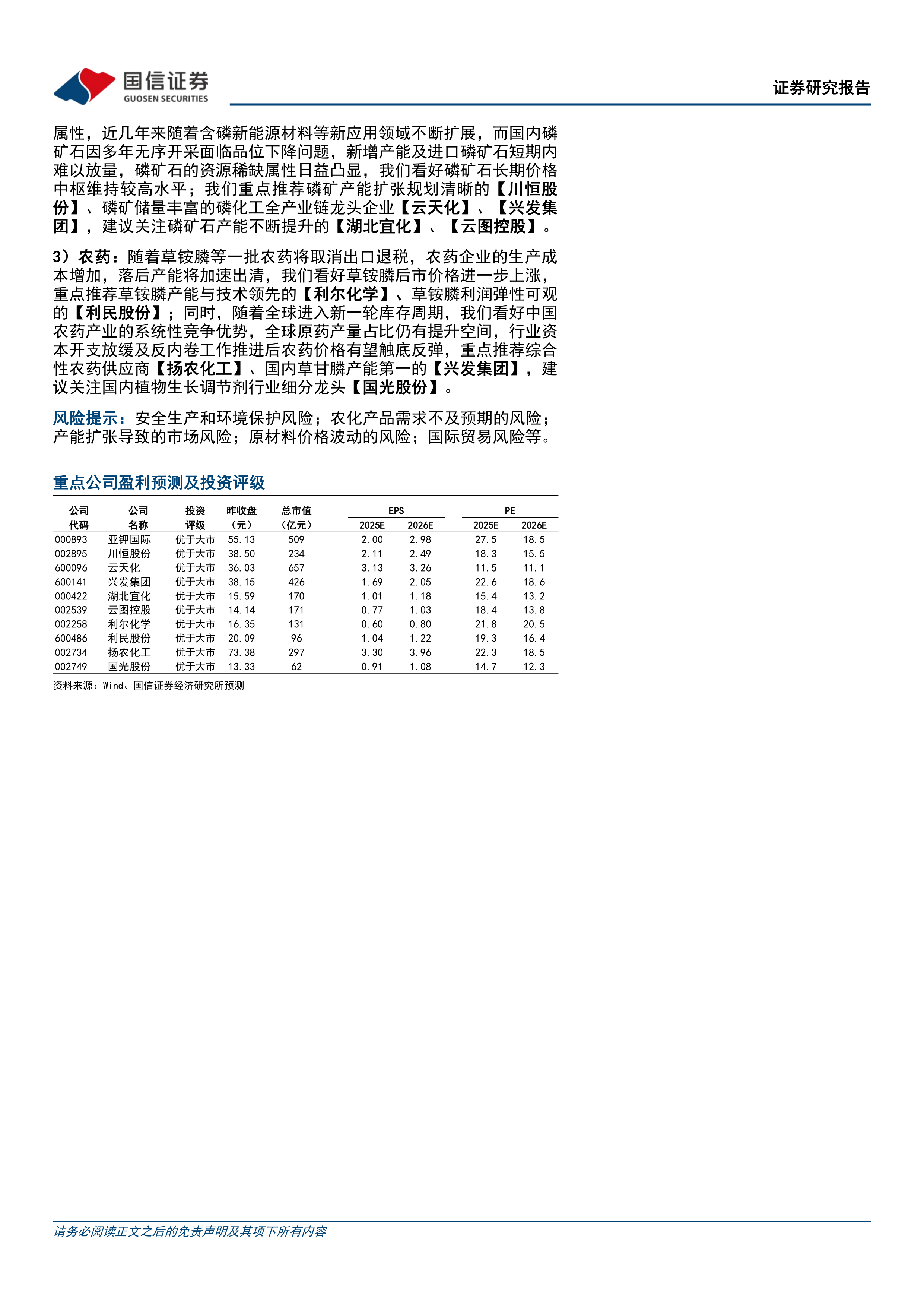 风险提示:安全生产和环境保护风险;农化产品需求不及预期的风险;产能扩张导致的市场风险;原材料价格波动的风险;国际贸易风险等。