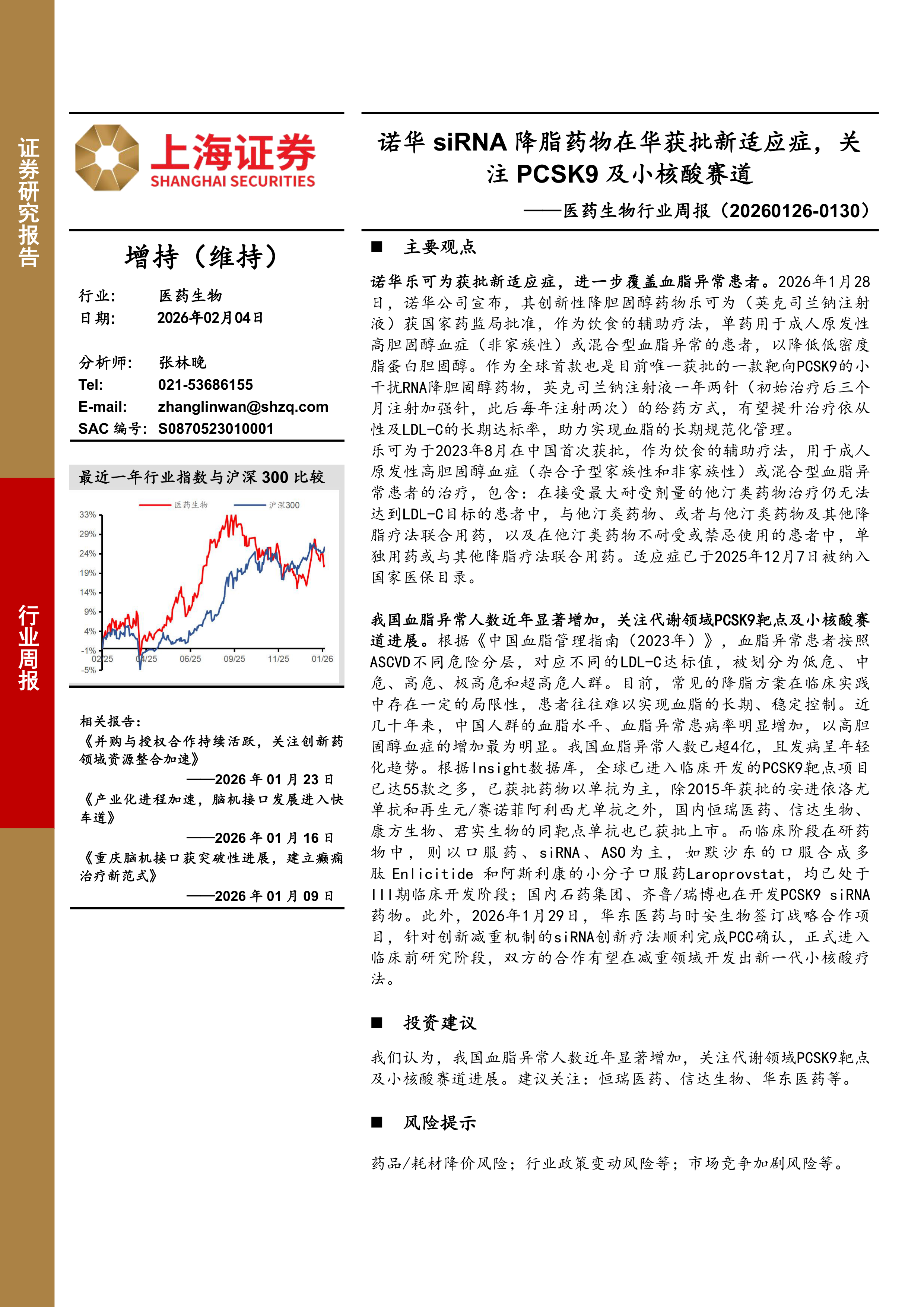 诺华乐可为获批新适应症,进一步覆盖血脂异常患者。2026年1月28日,诺华公司宣布,其创新性降胆固醇药物乐可为(英克司兰钠注射液)获国家药监局批准,作为饮食的辅助疗法,单药用于成人原发性高胆固醇血症(非家族性)或混合型血脂异常的患者,以降低低密度脂蛋白胆固醇。作为全球首款也是目前唯一获批的一款靶向PCSK9的小干扰RNA降胆固醇药物,英克司兰钠注射液一年两针(初始治疗后三个月注射加强针,此后每年注射两次)的给药方式,有望提升治疗依从性及LDL-C的长期达标率,助力实现血脂的长期规范化管理。