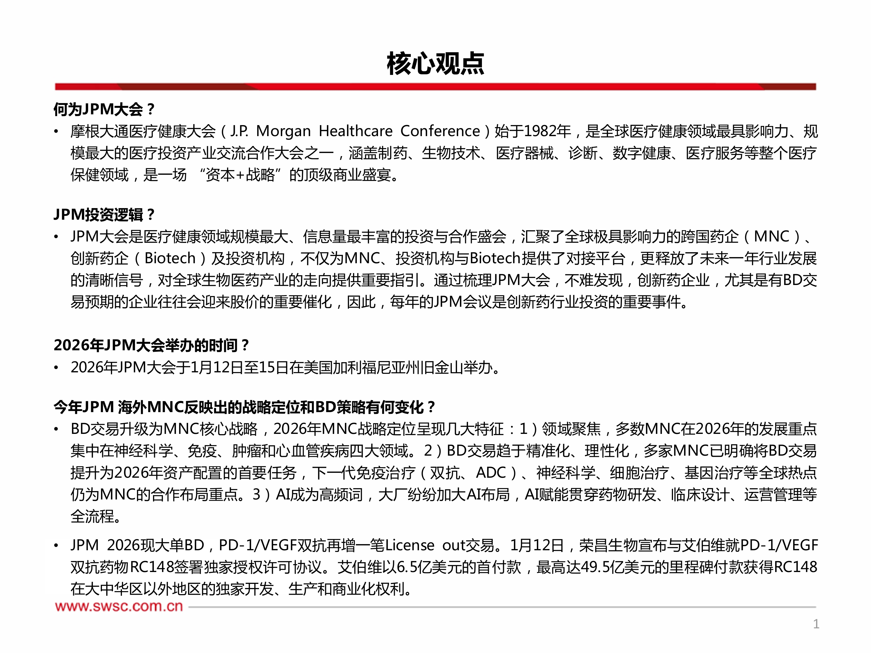 JPM大会是医疗健康领域规模最大、信息量最丰富的投资与合作盛会,汇聚了全球极具影响力的跨国药企(MNC)、创新药企(Biotech)及投资机构,不仅为MNC、投资机构与Biotech提供了对接平台,更释放了未来一年行业发展的清晰信号,对全球生物医药产业的走向提供重要指引。通过梳理JPM大会,不难发现,创新药企业,尤其是有BD交易预期的企业往往会迎来股价的重要催化,因此,每年的JPM会议是创新药行业投资的重要事件。