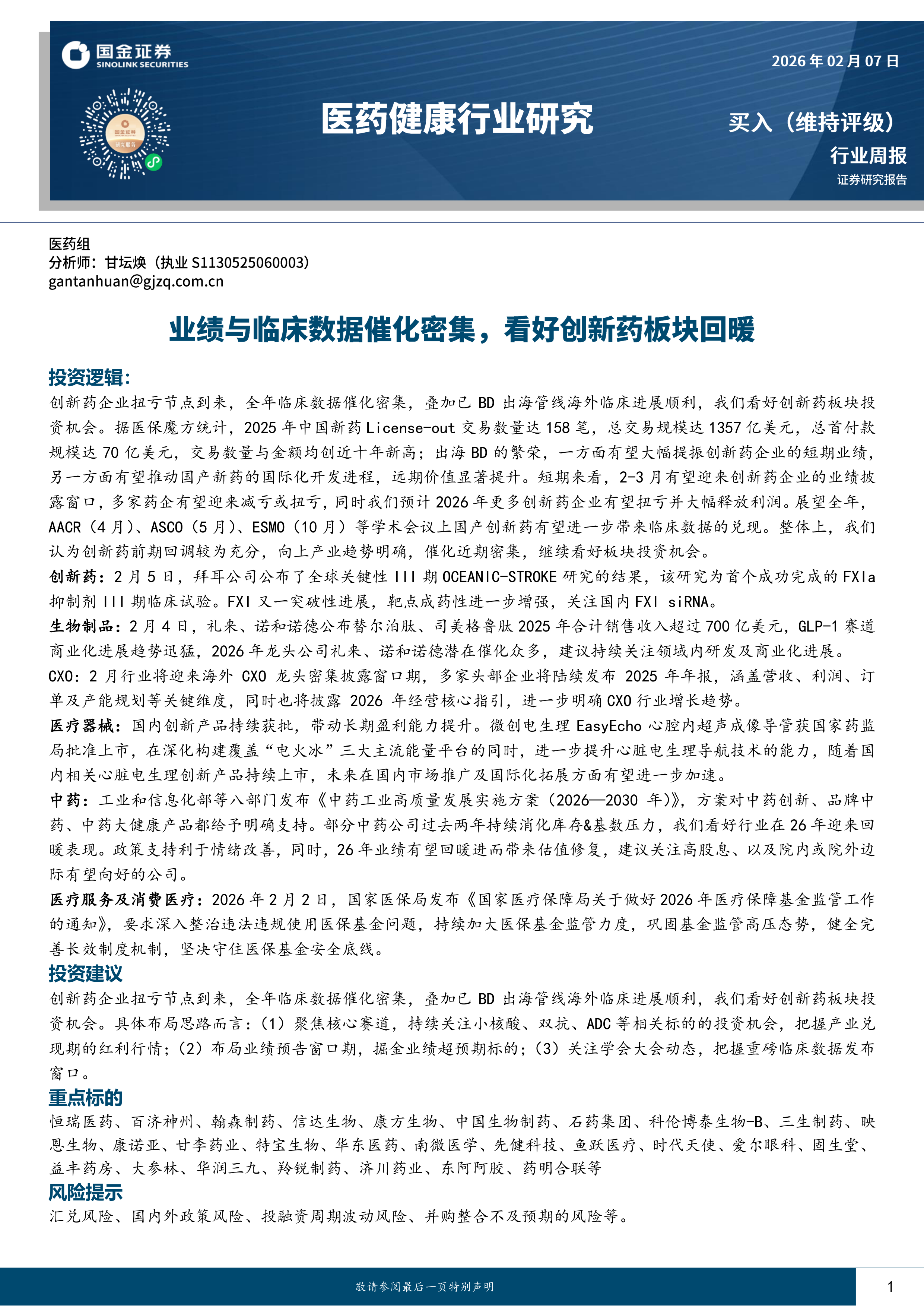 医药健康行业研究:业绩与临床数据催化密集,看好创新药板块回暖