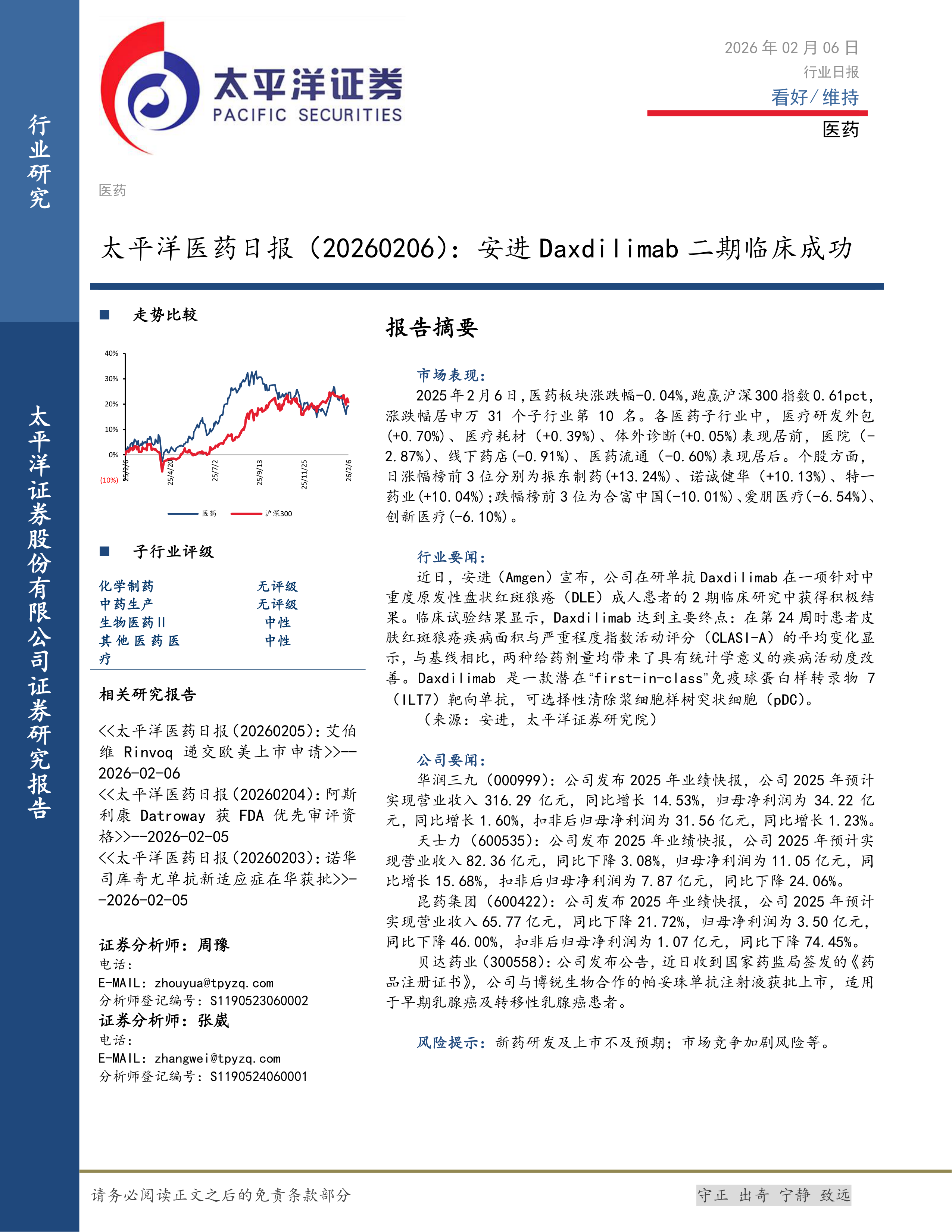 2025年2月6日,医药板块涨跌幅-0.04%,跑赢沪深300指数0.61pct,涨跌幅居申万31个子行业第10名。各医药子行业中,医疗研发外包(+0.70%)、医疗耗材(+0.39%)、体外诊断(+0.05%)表现居前,医院(-2.87%)、线下药店(-0.91%)、医药流通(-0.60%)表现居后。个股方面,日涨幅榜前3位分别为振东制药(+13.24%)、诺诚健华(+10.13%)、特一药业(+10.04%);跌幅榜前3位为合富中国(-10.01%)、爱朋医疗(-6.54%)、创新医疗(-6.10%)。