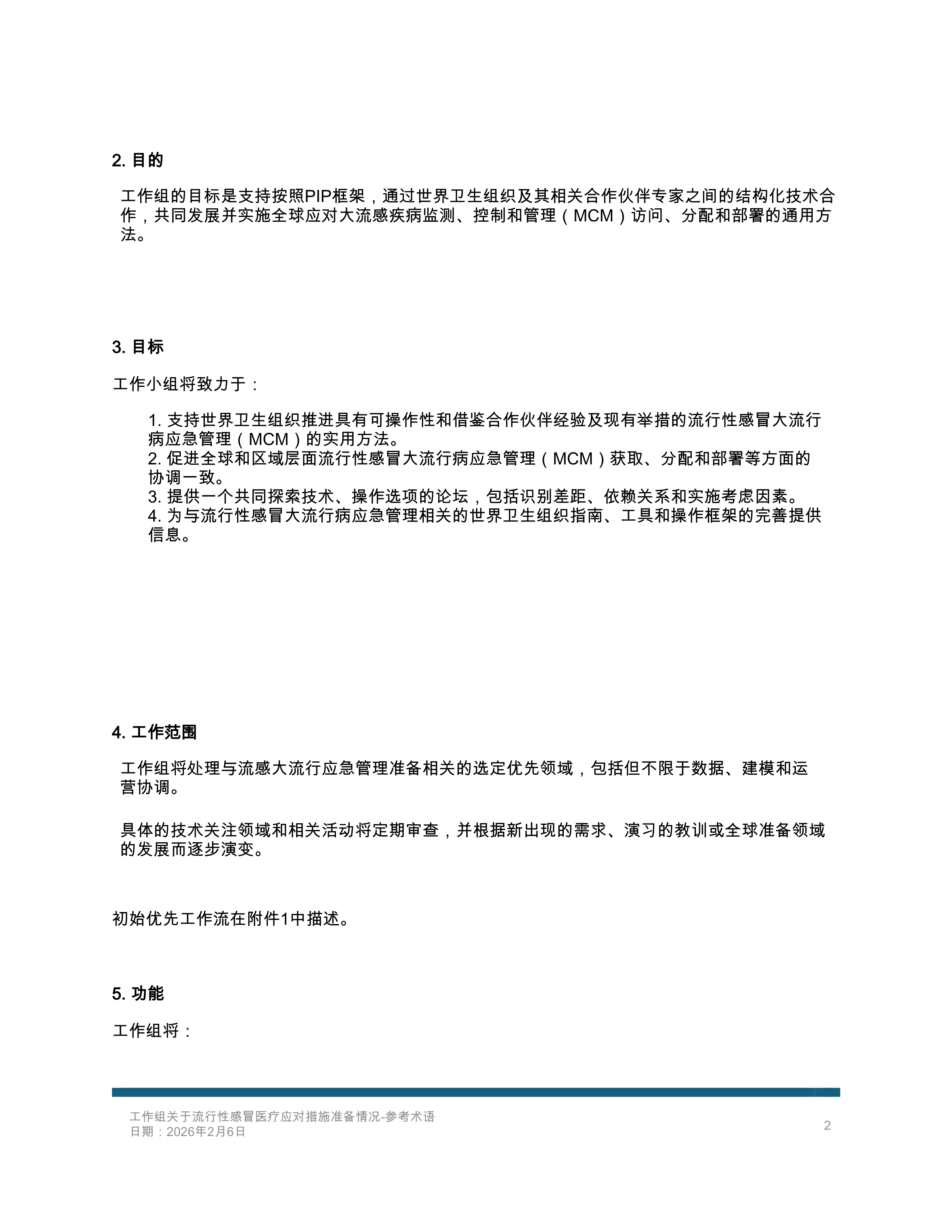 在最近模拟演练中获得的认识基础上2持续的技术工作,世卫组织将组建一个工作组,以支持与合作伙伴专家在有关大流行性流感MCM准备工作的优先技术和管理问题上的结构化合作。该工作组将促进共同探索选项、完善方法和测试假设,根据相关合作伙伴的专业知识和现有举措进行。