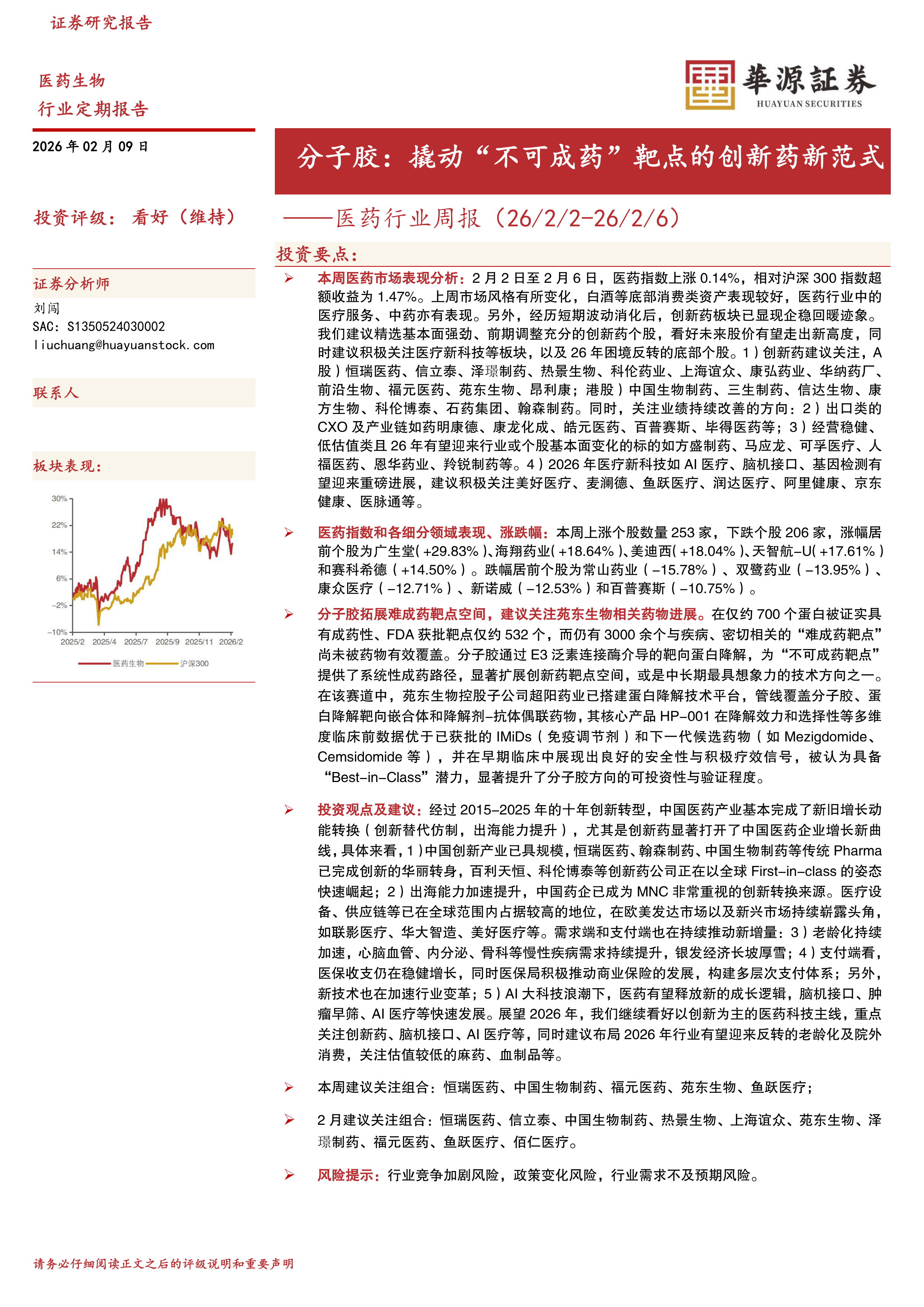 本周医药市场表现分析:2月2日至2月6日,医药指数上涨0.14%,相对沪深300指数超额收益为1.47%。上周市场风格有所变化,白酒等底部消费类资产表现较好,医药行业中的医疗服务、中药亦有表现。另外,经历短期波动消化后,创新药板块已显现企稳回暖迹象。我们建议精选基本面强劲、前期调整充分的创新药个股,看好未来股价有望走出新高度,同时建议积极关注医疗新科技等板块,以及26年困境反转的底部个股。1)创新药建议关注,A股)恒瑞医药、信立泰、泽璟制药、热景生物、科伦药业、上海谊众、康弘药业、华纳药厂、前沿生物、福元医药、苑东生物、昂利康;港股)中国生物制药、三生制药、信达生物、康方生物、科伦博泰、石药集团、翰森制药。同时,关注业绩持续改善的方向:2)出口类的CXO及产业链如药明康德、康龙化成、皓元医药、百普赛斯、毕得医药等;3)经营稳健、低估值类且26年有望迎来行业或个股基本面变化的标的如方盛制药、马应龙、可孚医疗、人福医药、恩华药业、羚锐制药等。4)2026年医疗新科技如AI医疗、脑机接口、基因检测有望迎来重磅进展,建议积极关注美好医疗、麦澜德、鱼跃医疗、润达医疗、阿里健康、京东健康、医脉通等。