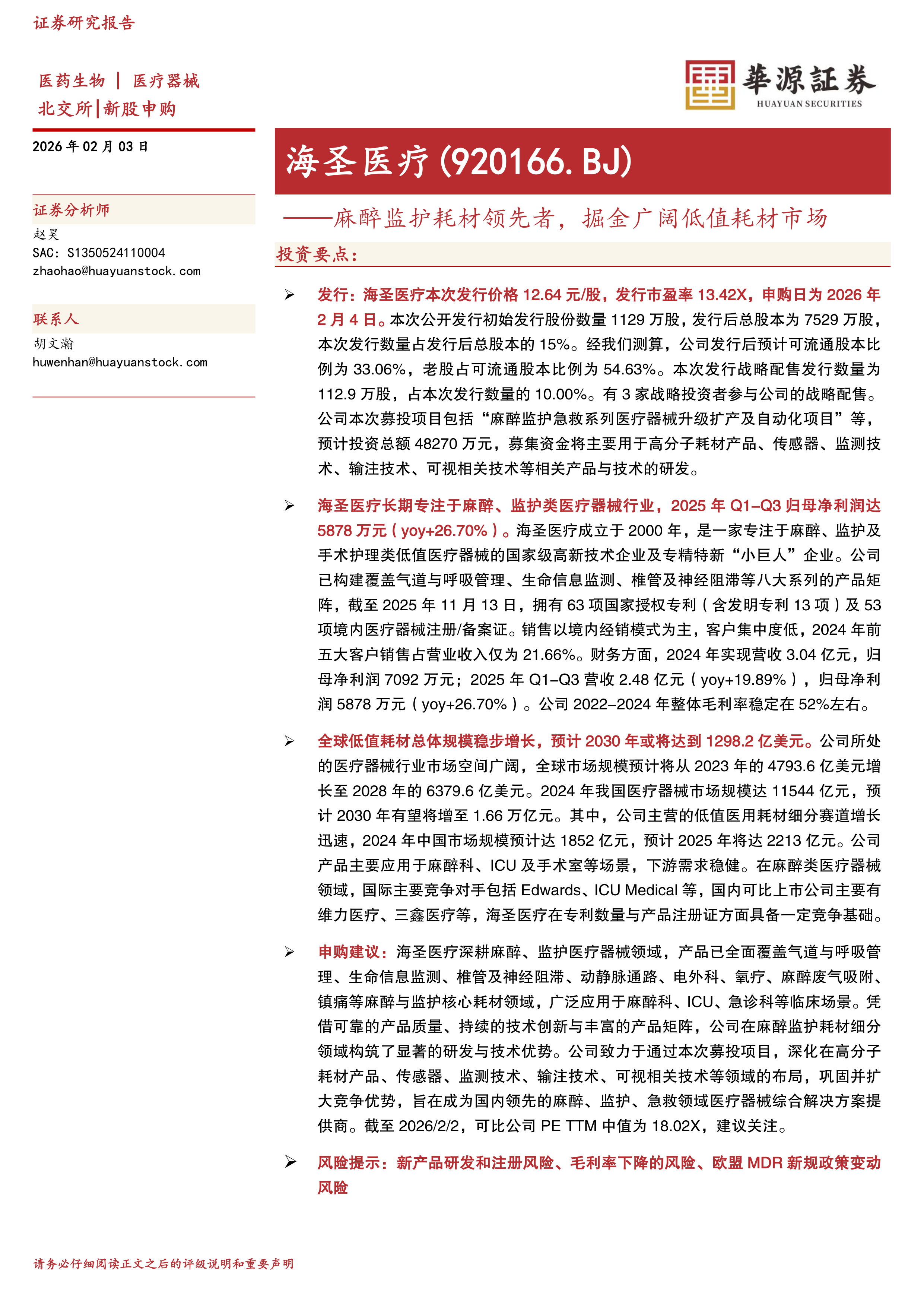 申购建议:海圣医疗深耕麻醉、监护医疗器械领域,产品已全面覆盖气道与呼吸管理、生命信息监测、椎管及神经阻滞、动静脉通路、电外科、氧疗、麻醉废气吸附、镇痛等麻醉与监护核心耗材领域,广泛应用于麻醉科、ICU、急诊科等临床场景。凭借可靠的产品质量、持续的技术创新与丰富的产品矩阵,公司在麻醉监护耗材细分领域构筑了显著的研发与技术优势。公司致力于通过本次募投项目,深化在高分子耗材产品、传感器、监测技术、输注技术、可视相关技术等领域的布局,巩固并扩大竞争优势,旨在成为国内领先的麻醉、监护、急救领域医疗器械综合解决方案提供商。截至2026/2/2,可比公司PETTM中值为18.02X,建议关注。