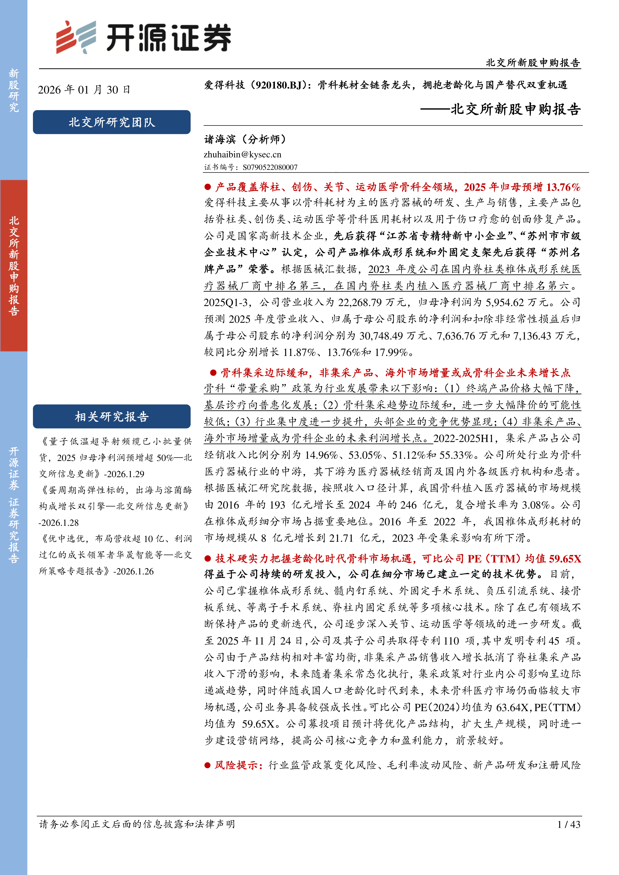 爱得科技主要从事以骨科耗材为主的医疗器械的研发、生产与销售,主要产品包括脊柱类、创伤类、运动医学等骨科医用耗材以及用于伤口疗愈的创面修复产品。公司是国家高新技术企业,先后获得“江苏省专精特新中小企业”、“苏州市市级企业技术中心”认定,公司产品椎体成形系统和外固定支架先后获得“苏州名牌产品”荣誉。根据医械汇数据,2023年度公司在国内脊柱类椎体成形系统医疗器械厂商中排名第三,在国内脊柱类内植入医疗器械厂商中排名第六。2025Q1-3,公司营业收入为22,268.79万元,归母净利润为5,954.62万元。公司预测2025年度营业收入、归属于母公司股东的净利润和扣除非经常性损益后归属于母公司股东的净利润分别为30,748.49万元、7,636.76万元和7,136.43万元,较同比分别增长11.87%、13.76%和17.99%。